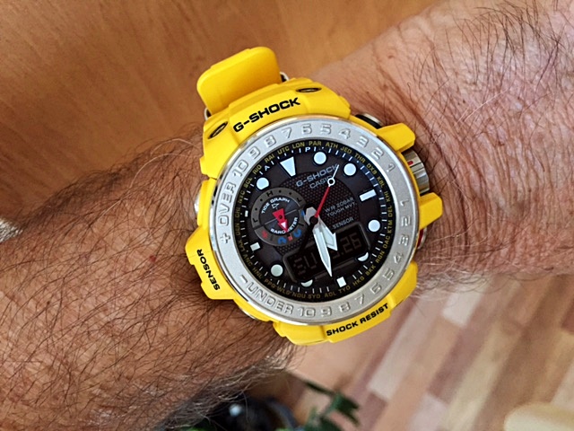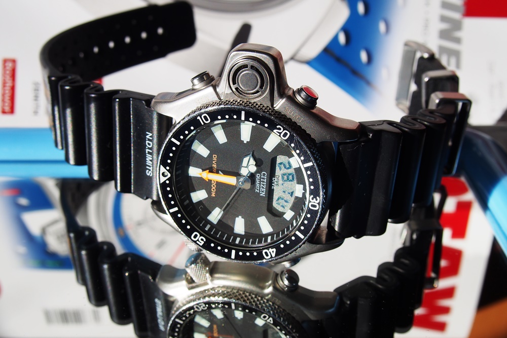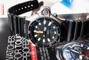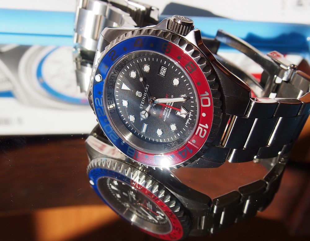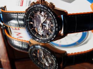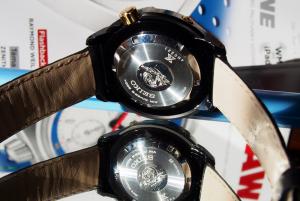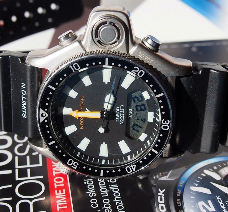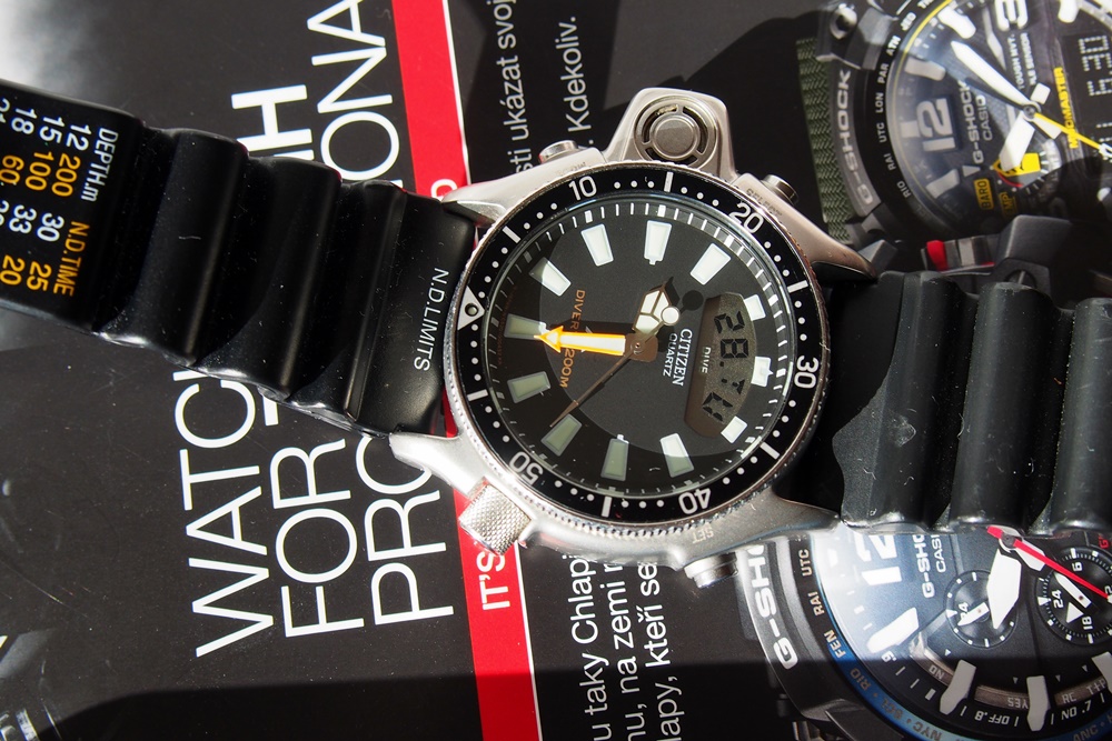 Pánové, dovolte mi , abych vám trochu volnou formou představil mé čtyři nové kousky, pořízené během posledních necelých dvou měsíců. Jedná se vesměs o stejný typ hodinek, neboť usedlejší kousky mi příliš nejdou k pleti a neumím je nosit. A tak mi dovolte představit svoji námořní jednotku: I. Velitel SEAL Team11 SEIKO Astron Jediné hodinky z této sestavy, které nemám nově, ale cca deset měsíců. V jednotce zařazeny pro svoji universálnost, GPS, luxusně zpracované pouzdro a ještě lépe ciferník. Stovková vodotěsnost umožňuje univerzální použitelnost. Původně na Seiko gumě se signovanou ocelovou sponou a přezkou, která pro každodenní nošení nahražena vodotěsným HIRSCHem. II. Zástupce velitele Casio G-Shock GWN 1000H-9A ABC hodinky s příjemnou váhou v letní barvě s 200 WR III. Velitel družstva Steinhart OCEAN Forty-Four GMT BLUE-RED Notoricky známé štajny v rozměru 44 s keramickou lunetou a solidním tahem, opatřené ETou 2893-2 s GMT ručkou. Hodinky zabíhám a těší mě dosud naměřená přesnost cca 2s/24 hodin. IV. Jednotka SEIKO SRP641 Protože jsem potřeboval něco obyčejnějšího, pořídil jsem si tato Seika. Původně na gumě, vlastně Seiko plastu, který mi nikdy nepřirostl k srdci, a tak přesazené na vodotěsný řemen ZRC. Strojek 4R36 s hackingem, po doladění a vhodné poloze chodí do 2-4 s/24 hodin. Myslím, že další info netřeba. V. Jednotka Citizeny JP2000 Skutečný dělník. Hodinky z řady Promaster působí poměrně malým dojmem, zřejmě díky úzké lunetě, která umožňuje poměrně velký průměr ciferníku. Hodinky mají indikátor hloubky. Velice pohodlně se nosí. Poslední obrázek srovnává svítivost Seika a Citizenů. Každé hodinky mají jinou barvu indexů. Zelená barva indexů u Citizenů je znát i přes den, no které hodinky svítí déle se přiznám, jsem nesledoval. Děkuji za pozornost