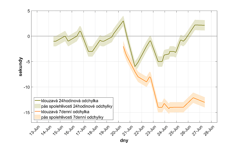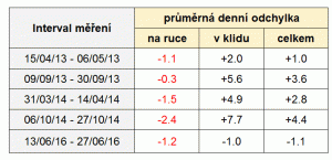 Po delší odmlce posílám pokračování měření přesnosti mých GS SBGR051, které nyní slouží tři roky a tři měsíce. Měření probíhalo dva týdny od pondělí 13. června do pondělí 27. června. Hodinky nebyly dotahované korunkou a mimo zápěstí odpočívaly vždy číselníkem nahoru. Interpretace grafů je vysvětlená v mém prvním příspěvku v tomto vlákně. Obr. 1: Časová řada výsledků měření Obr. 2: Změny odchylek přepočtené na 24hodinový základ Obr. 3: Klouzavé denní a týdenní odchylky Hlavní číselné charakteristiky: celková doba měření: 14 dní a 10 minut, z toho hodinky 23% času na ruce a 77% času odložené v klidu průměrná doba na ruce ve dnech, kdy byly hodinky nošené: 7 h 42 min (medián 7 h 30 min) průměrná doba odložení hodinek přes víkend: 64 h 2 min (63 hod 59 min, 64 hod 5 min) průměrná denní odchylka: -1.1 s (odchylka na konci experimentu vztažená k celkové době měření) průměrná denní odchylka na ruce: -1.2 s (součet odchylek dosažených na ruce vztažený k celkové době strávené na ruce) průměrná denní odchylka v klidu: -1.0 s (součet odchylek dosažených v klidu vztažený k celkové době strávené v klidu) průměrná / minimální / maximální 24hodinová klouzavá odchylka: -1.2 s / -6.0 s / +3.0 s průměrná / minimální / maximální 7denní klouzavá odchylka: -14.3 s / -10.9 s / -2.0 s Srovnání průměrných odchylek všech zatím provedených měření (jedná se o denní odchylky, tj. o teoretické hodnoty vzniklé přepočtem naměřených hodnot na 24hodinový základ): Závěr: Specifikem tohoto měření je skutečnost, že hodinky pobývaly na ruce poměrně málo: 23% celkového času. Tím si vysvětluji to, že postupně nabíraly zpoždění (také je ovšem možné, že to naznačuje potřebu první servisní údržby). V nočních hodinách došlo k občasnému většímu výkyvu chodu, ale na to jsem u nich zvyklý. Celkově jsem spokojený s tím, jak hodinky zvládají období mírné zátěže, K obstarání energie pro uspokojivě přesný chod (v průměru -1.1 s denně) jim stačilo pobývat na zápěstí necelých 8 hodin pět dní v týdnu, přičemž přes víkendy nedostávaly po 64 hodin k jídlu vůbec nic.
