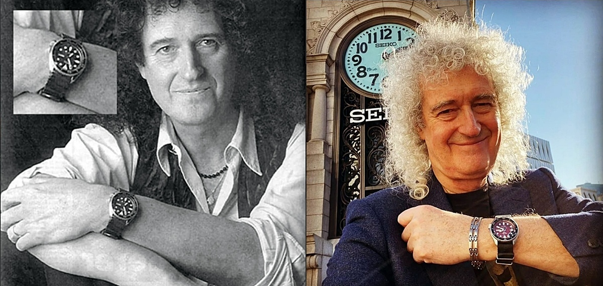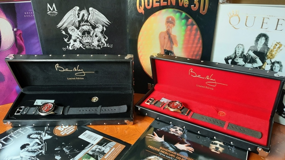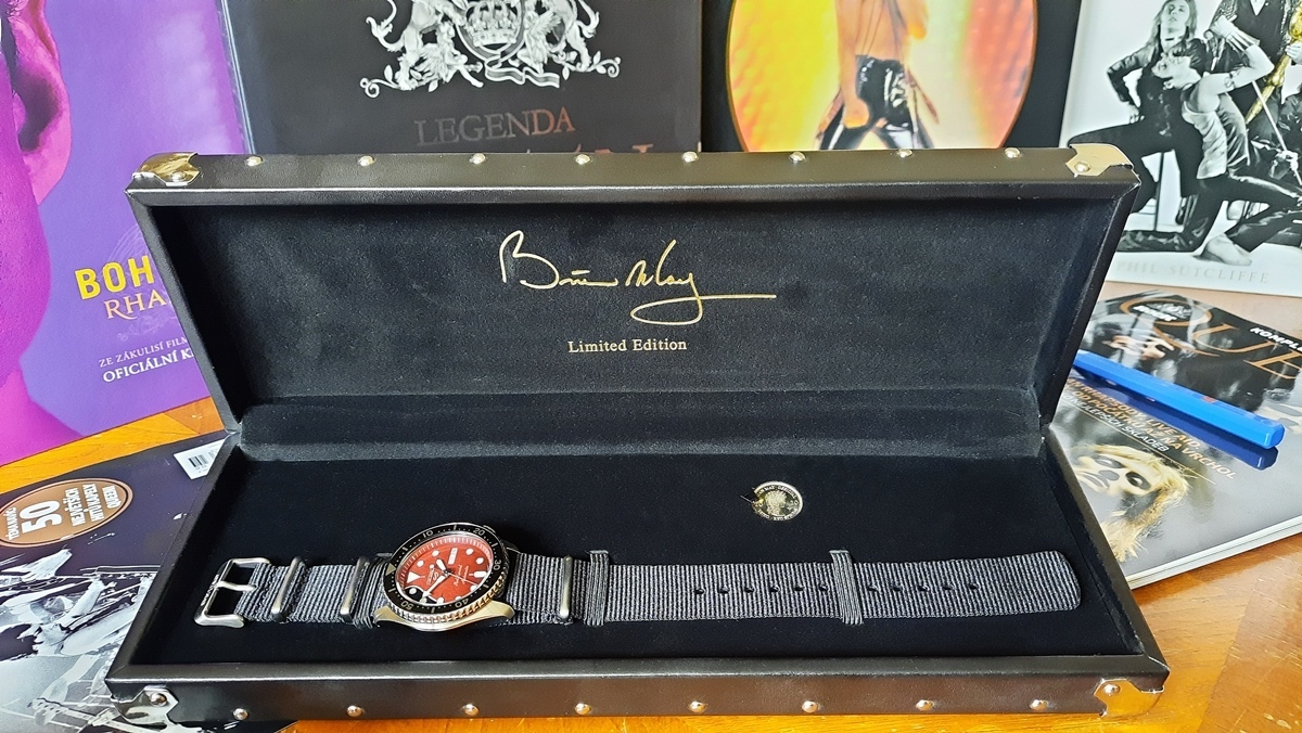 Hezký den kamarádi, rok s rokem se sešel a já mám zase důvod napsat sem pár řádků. Zvolil jsem toto vlákno, i když bych v podstatě mohl založit vlákno nové, ale myslím si, že sem to prostě patří a jak se říká mezi námi intelektuály, "kruh se uzavřel". Stalo se totiž to, v co jsem tak nějak věřil, že se jednou stane, a co mi tady také řada z Vás hned od počátku podsouvala. Kde se vzala, tu se vzala, jednoho dne se v inzerci zjevila nabídka. Protože já jsem flink a moc to nesleduju, muselo přijít nakopnutí zvenčí a to od mého "anděla strážného", který mi nechal na WhatsAppu zprávu s odkazem na inzerci a s poznámkou, že bych s tím měl asi něco udělat. Díky Ondrovu pošťouchnutí jsem tedy na inzerát odepsal, dohodl se a nakonec osobně, při příjemném setkání s původním majitelem, převzal tuto krabici... ...jednu takovou už doma mám a tak to může vypadat nelogicky, asi jenom pitomec si koupí dvoje stejný hodinky... ...uvnitř jsou i stejná pouzdra, zmenšeniny kytarových futrálů, ale...oko bystrého pozorovatele najde nepatrný rozdíl... ...ano, logo hodinkové značky je vyvedené ve stříbrné barvě...no a uvnitř už je to jasné na první dobrou. Hurá!!! Jsou to ony, Seiko 5 Sports Brian May Limited Edition SRPE83K1 Red Special, první limitovaná edice ve stříbrném provedení... Pár údajů: Model: SRPH83K1 Pouzdro: ocel Strojek: Seiko 4R36 automat s rezervou 41 hodin Sklíčko: Hardlex Řemínek: textil Velikost: 42,5 mm Váha: 94 g Vodotěsnost: 100 m Komplikace: ukazatel dne a data vydání: jaro 2020 počet kusů: 9000 Něco málo fotek z prezentace limitky se zástupci společnosti Seiko a jejich ambasadorem, kterým je Brian May, kytarista skupiny Queen... ...sir Brian May a Seiko na jeho zápěstí tehdy a poté s limitkou... ...Brian May se Seiko na zápěstí a s Fredíčkem po boku... ...no a Brian May po letech, ale opět s nástrojem, který dal jméno těmto hodinkám. Protože jsem rozdíly mezi oběma modely popsal výše, nechám k Vám promlouvat jen pár fotek a Vy už sami posuďte, jak se to společnosti Seiko a Brianovi povedlo... ...no a nakonec, jak jinak, hodinky na ruce, to dá rozum... Tak se mějte a zase někdy... J.R.