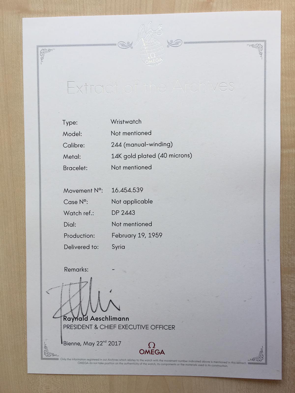 Začal jsem pátráním na Omega webu, kde jsem k tomuhle modelu nenašel vůbec nic. Pak jsem psal přímo do Omegy co se s tím dá dělat a asi po dvou dnech dorazila "obecná" odpověď, že se mám stavit u dealera, nechat je otevřít a zkusit na webu hledat podle čísla strojku (což taky nepomohlo) a nebo si objednat "Extract of the Archives" za 120 CHF. Pak jsem dorazil s hodinkama k autorizovanému dealerovi, kde mi řekli, že ten extract jsou schopni zajistit u Omegy sami, což pro mě bylo jednodušší než vyplňovat nějaké formuláře na webu, převádět předem peníze a čekat na poštu. Takže hodinky zůstaly asi měsíc a půl u dealera a pak jsem si je vyzvedl i s tímhle papírem z Omegy (za 3.000,- Kč, tedy víceméně za stejnou cenu jako kdybych si to objednával přímo sám).
