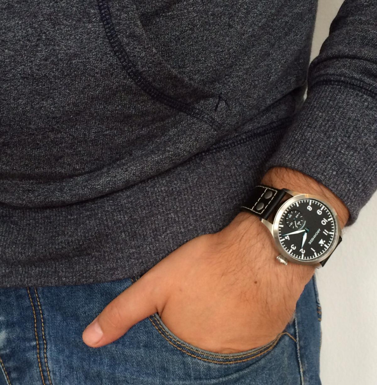 Zase je všechno jinak, mlátí to se mnou jako v pubertě...Sinny, které jsem pořídil místo Hammů se u mě ohřály pouze měsíc. Prodal jsem je drobet pod cenou, ale srdce mi to netrhá, jelikož si je pořídil kolega z práce a já tak zasel chronobundus do dalších řad Když jsem Sinny kupoval, hleděl jsem na všestrannost a univerzálnost. Nicméně WR200m je celkem k ničemu dokud jsou hodinky na koženém řemenu. Gumový řemen před dovčou nedorazil a tak jsem s sebou bral Suby. Ty se mnou absolvovaly aquapark, vysokohorskou tůru a pocení půlek v autě. Pro mě jsou Suby stále nej a nedám na ně dopustit. Chod lunety Subů zatím nemá soupeře a byl pro mne ve dvou předchozích případech jedním z hlavních důvodů proč hodinky poslat dále do světa. Dalším zjištěním je že, přestože měly Sinny sloužit jako otloukánky a hodinky pro volný čas, choval jsem se k nim stejně obezřetně jako k Subům. Na své věci jsem zkrátka opatrný a je jedno jestli jsou za litr nebo za dvěstě litrů. Jsou činnosti, při kterých hodinky odkládám a velmi účinně tak předcházím případným škodám. Tím, že se Sinny nedostaly na ruku toliko jak bych si představoval, tak se bez winderu pochopitelně zastavily a jestli mě něco nebaví, je znovu nastavování data když potřebuji hodinky vzít a jít. S manuálním nátahem je to jiné kafe, to mě baví a náramně jsem si ho užil, když jsem měl Primky Hulk. Volba dalších hodinek byla celkem jasná, manuál nátah...Myšlenkově jsem se vrátil k pilotkám Archimede XLH TOP, které v čase před měsícem soupeřily s výše uvedenými Sinny. Nutno říci, že jsem u Archimedu zůstal nejenom v myšlenkách. Vnitrně jsem zápolil jsem s velkostí 45mm, ale unosil jsem i větší kousky, tak proč ne tyto? Myslím, že padnou parádně, obvod zápěstí mám nyní 18cm. Tikání strojku je hudbou pro uši a perfektní antireflex s efektem mizejícího sklíčka jenom podtrhuje pozitivní dojmy. Navíc jsem patrně pořídil jedny z vůbec posledních "nových" hodinek v provedení TOP Závěrem chci říci, že má snad nyní dušička pokoj a povedlo se mi vytvořit Power Kombo - Potápky, Pilotky.