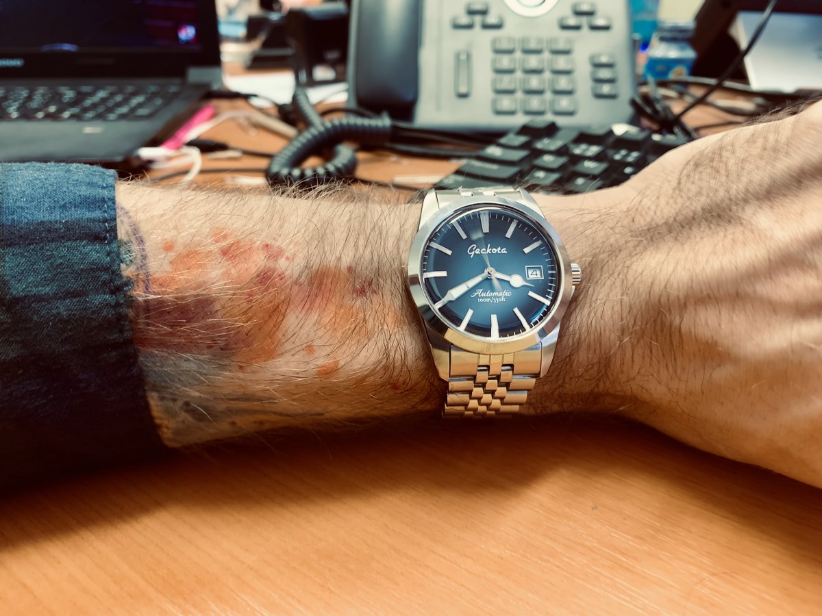 Ahoj, tak jsem to nakonec nevydržel a koupil nové. Ten modrý ciferník je náááádherný, bohužel se tedy nedá moc dobře vyfotit, protože pod každým úhlem hází trošku jinou barvu. Níže dávám pár rychlocvaků z krabičky, později dodám další fotky a za pár dní se podělím s prvními dojmy, co se týče nošení - na první dobrou hodně pohodlné, ani o nich na ruce nevím. nějaké info: pouzdro: průměr 36 mm (někde se uvádí 36,5, neměřil jsem) šroubovaná korunka dýnko s průhledem na strojek sklíčko: jemné vypouklý safír s anti-reflexem ciferník: modročerný luminiscence SuperLuminova BGW9