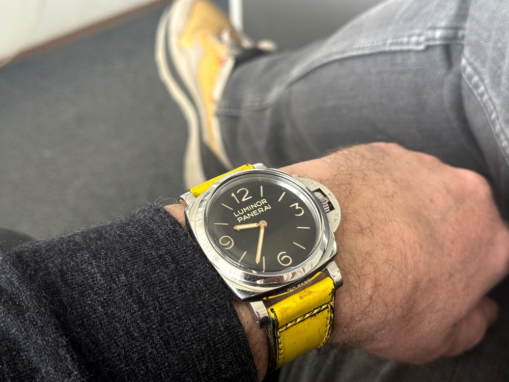 Remen je z etsy Kupoval som tam uz 6 remenov. 4x koza a 2x canvas. Az na jeden canvas som velmi spokojny (A tam to bola moja chyba v zadani. Resp. ani nie tak chyba ako to, ze som si zvolil vypchaty canvas a nepaci sa mi to. Druhy, na Radiomir je super truper.). Zvolil som tentokrat väcsiu dlzku 130/80 aj ked som stale bral 125/75 (pre mna ovela lepsie, nemam rad ked remen precnieva), no ale co uz Sirka je 26/22. Spona je vsita do remena. Takto som to doteraz nemal ani v jednom pripade, tak ze to skusim. Ta spona je "akoby" väcsia, mohutnejsia, taka "nesikovnejsia". Ale paradoxne po celom dni ok a az necakane v pohode, netlaci, nevadi, vsetko sedi. Ta na fotke je uz z dalsieho remena (musel som), ale je rovnaka ako na zltom.
