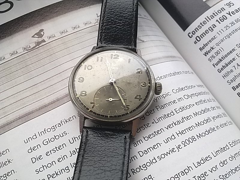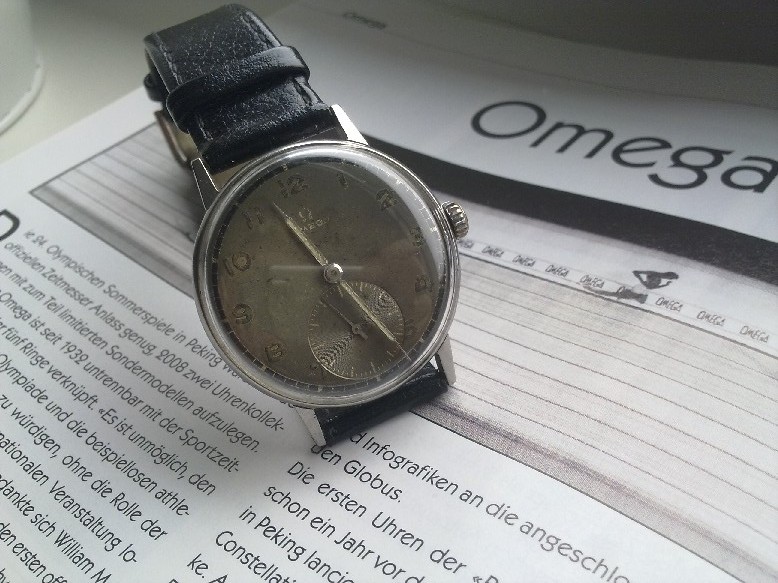 Dobrý den, pánové. Před pár měsíci jsem dostal od dědy tyto hodinky. Znalci si podle fotek jistě všimnou, že jsou zde nepůvodní ručky (děda chtěl, aby měly lumi) a korunka také bude měněná. Podle kalibru, který je 30T2PC, jsem zjistil přibližnou dobu výroby. Cca 1945. Což se shoduje i se sériovým číslem. Strojek se mi opravdu velmi líbí. Přesnost chodu je pro mě neuvěřitelná: pár vteřin za den - a to jsem ještě nezkoušel regulaci. Věc, kterou bych moc rád změnil je ciferník. Je už ve velmi špatném a nečitelném stavu. Proto bych se rád obrátil na vás s prosbou o pomoc. Je mezi váma spousta hodinářů a sběratelů. Nevěděl byste někdo, kde sehnat jiný ciferník za dobrou cenu? Vím, že existuje možnost si číselník objednat u Omegy za nějakých 5000kč, ale určitě bude existovat i levnější možnost. Nějaký reprint v Polsku se mi taky moc nepozdává... A kdyby někdo z vás měl třeba modřené ručky do těchto hodinek, či origo korunku, tak bych také měl zájem... Předem vám moc děkuji za případné rady či návrhy. Zde nějaké foto (bohužel foceno mobilem):