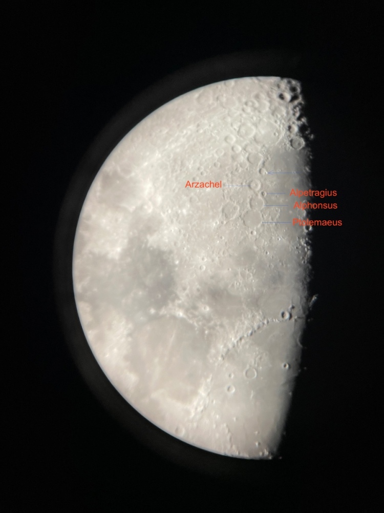 Krasavec, jen co je pravda. Musím říct, že jsem vlažnější hvězdář než jak jsem si to plánoval. Buď je moc zima nebo málo času nebo něčeho jiného málo nebo moc : -D No asi třikrát jsem dalekohled vystrčil z domu - Měsíc jsem trošku zkoumal a zahlédl i Jupiter (nakolik to šlo z terasy ve městě). Rád bych si pořídil nějaký adaptér, abych mohl dělat pořádné fotky a taky ještě vyměním okulár, abych mohl kouknout na měsíc blíž (zatím mám 10x a 25x). Jinak kolimace je vážně jednoduchá a vzhledem k tomu, že jsem dalekohled nikam nepřevážel, tak pořád drží. Tady moje zcela začátečnické foto a to, co se mi podařilo na měsíci identifikovat : -D