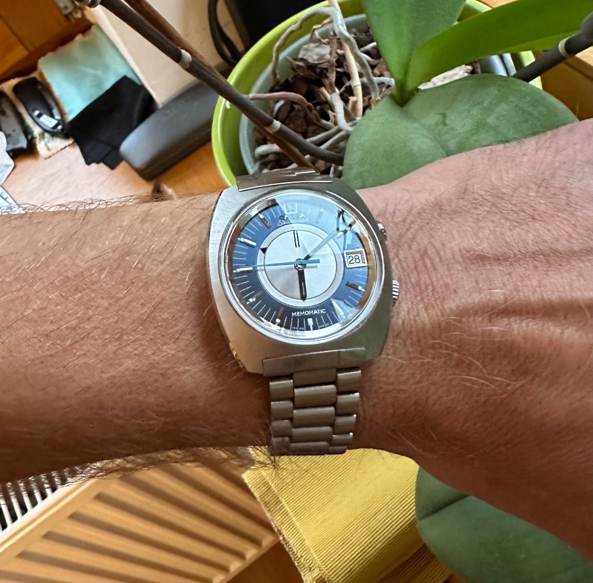 Přáíelé, nikdy bych tomu nevěřil, ale vlákno, které jsem tady před 10 lety založil, můžu dnes opět oživit. V roce 2013 jsem koupil v NOS stavu Memomatic. Nadchly mě tak, že jsem o nich napsal obsáhlejší recenzi, která je v tomto vláknu. Po roce a půl jsem potřeboval peníze na jiný kousek a tak jsem je prodal. No a od té doby jsem toho litoval. Když už pak nějaké peníze na hromádce byly, tak jsem zjistil, že cena poněkud stoupla a kousky v opatrně nošeném nebo nenošeném stavu se prodávají za raketu, takže jsem si nechal zajít chuť. Až minulý týden jsem narazil na inzerát na našem Chronomagu ... a bylo to. Jednání se zdejším členem ze Slovenska bylo výborné, takže dnes dorazil pošťák, no a já jsem šťastnej jako blecha. Jedná se o referenci 166.072 první typ pouzdra. Ty, co jsem měl před 10 lety, byly druhý typ - tedy s větší leštěnou plochou na pouzdru. Asi se mi víc líbil ten druhý typ, ale tento design je robustnější a blíž k designu Omega Mark II, III nebo 4.5, který mám rád. Navíc tentokrát i s originál tahem. Tehdy jsem měl pouze mesh a kožený Šímův řemen. Hodinky jsou ze Švédska, jsou po servisu a jsou ve výborném stavu. Zdají se skoro nenošené a nebo jsou suprově přebroušené (včetně sunburstu) a přeleštěné. Já samozřejmě doufám, že platí první varianta , ale budu rád za vaše názory.