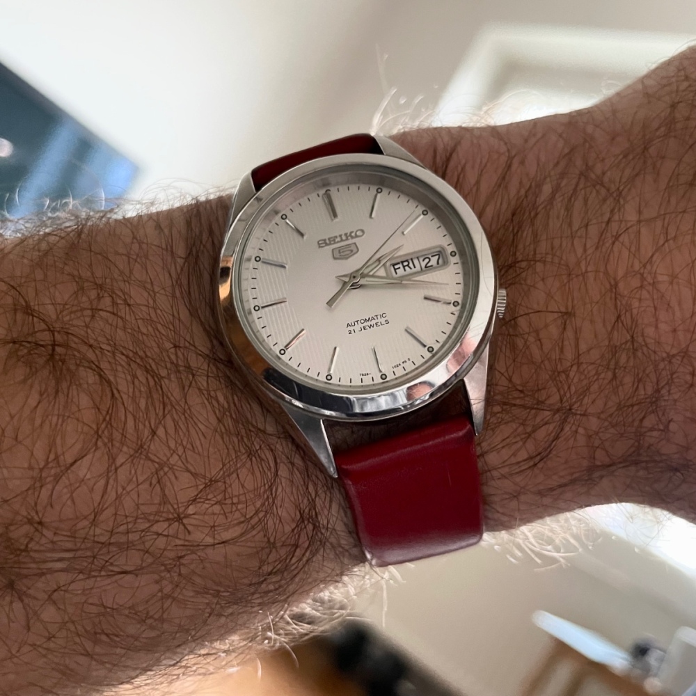 Pujcil jsem si od zeny na zkousku jestli zkousnu na 19,5cm zapesti 38mm hodinky. No… pripadam si hrozne homosexualne. Je to strasne maly ikdyz na fotce zblizka to nevypada.