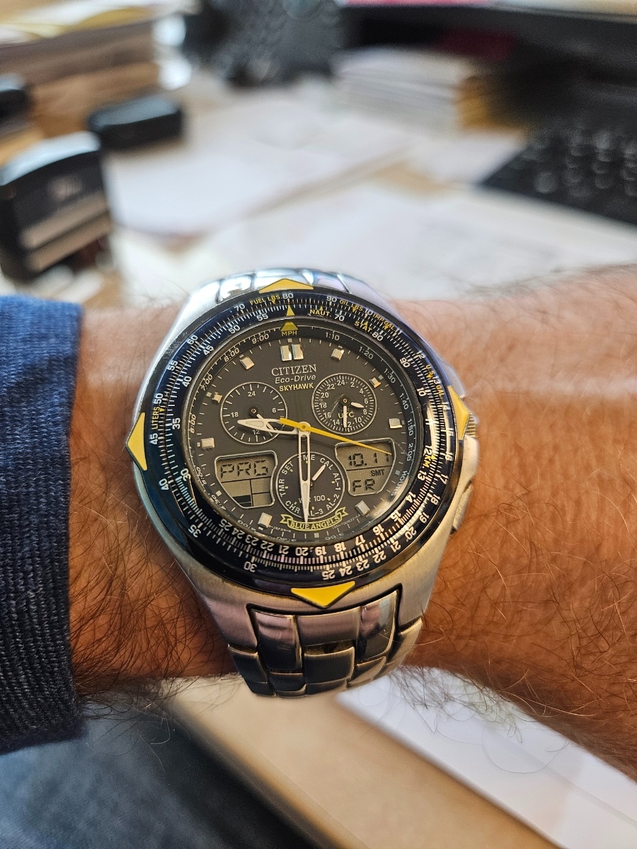 Tyto Skyhawky-Blue Angels mám od roku 2008. Mají na sobě hodně šrámů, ale pořád vypadají slušně. Dlouho jsem je nosil jako jediné hodinky v režimu H24. Splňovaly vše, co jsem od hodinek/chronografu očekával. K dokonalosti mi tehdy chybělo radiocontrolled a osvětlení displeje. Pozdější modely tyto fičůry myslím měly. Baterka je původní, více než 16 let stará. Když nechám hodinky nabíjet přímo na ostrém sluníčku, nabije se na 3 čárky ze 4. Do plna to už nejde. Zasloužily by si servis, nové sklíčko, baterku, vyčistit vnitřek, pár věci se hůř ovládá. Souvisí to s ovládáním hlavního menu skrz korunku. Asi jsou tlačítka a korunka jen zaneseny nečistotami. Jinak samotná strojovna s baterkou pořád funguje. Shrnutí: pohonu Eco-Drive se člověk vůbec nemusí bát