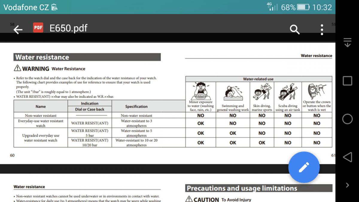 Přidám několik vlastních zkušeností a poznatků: WR - viz obrázek Je to z jiného modelu Citizen, ale v návodu pro zmiňovaný model (kalibr E111) platí to samé (je to v návodu na stranách 14 a 15) Takže plavání je v pohodě. Nicméně v každém návodu Citizen je zmínka, že se mají hodinky pravidelně každé 2-3 roky kontrolovat, aby byla zajištěna vodotěsnost. To zřejmě nikdo nedělá, já taky ne. Ze zahraničí to většinou vychází dráž než v ČR. Tam si kupuje někdo hodinky, které nejsou sehnatelné v Evropě. Někdo chce třeba zlatou variantu a tu mají například jen v Japonsku. Pokud netrváš na nových, tak se někdy zadaří koupit něco pěkného třeba na Ebuy v zemích EU (odpadá platba DPH+clo), ale musíš číhat. Mě to trvalo třeba rok než jsem vydražil co jsem chtěl a za sumu, kterou jsem akceptoval. Také bazoš nabízí někdy dost širokou nabídku použitých hodinek. Zmiňovaných CZ obchodů bych se asi nebál.