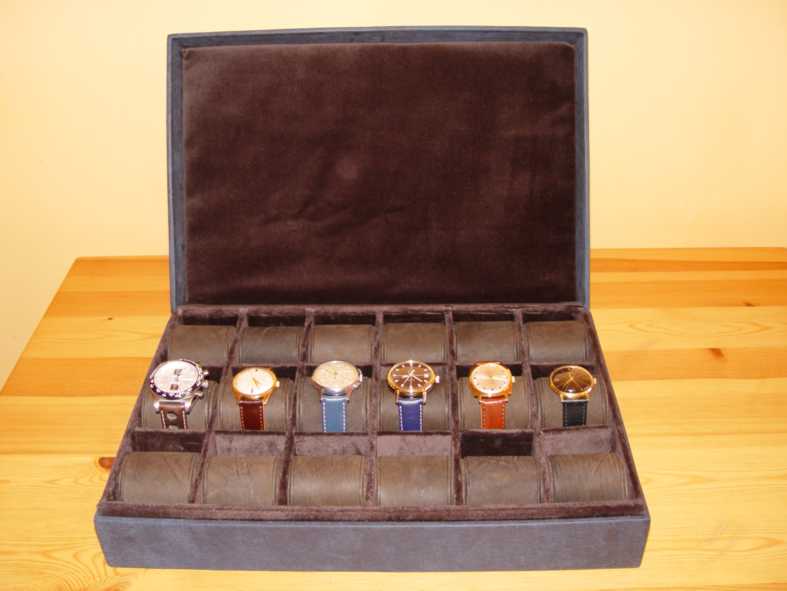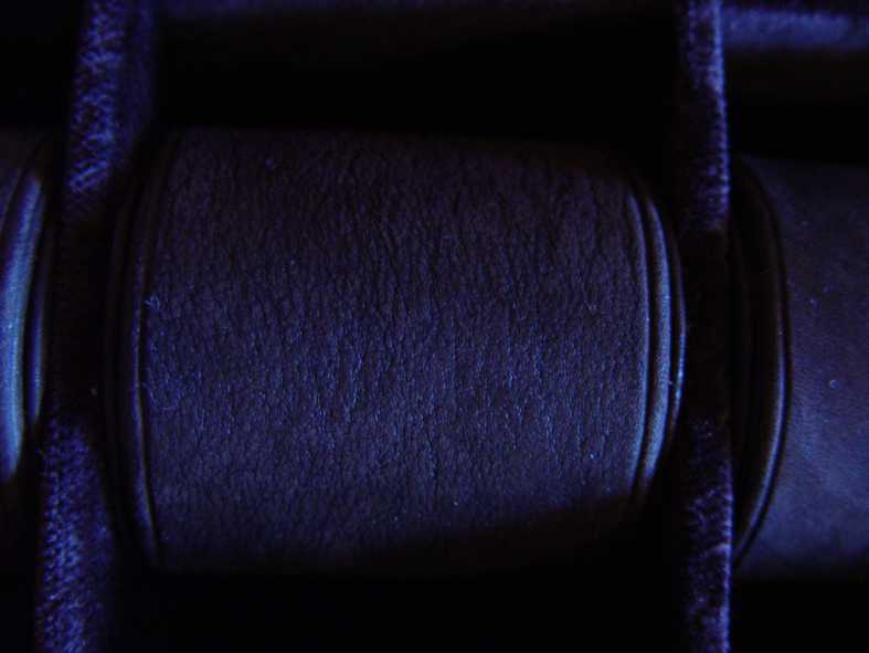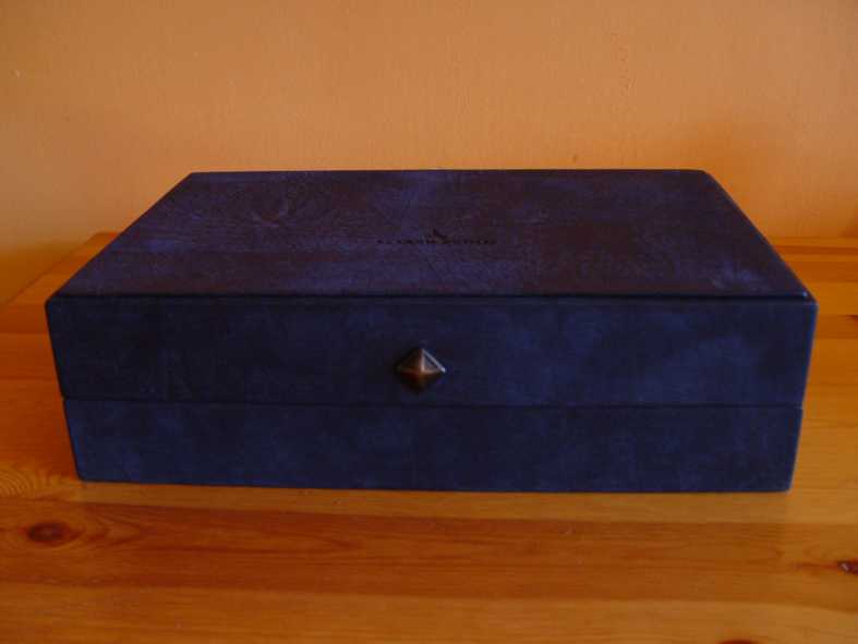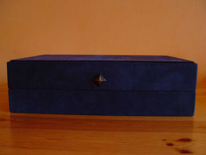 Chtěl bych touto cestou představit kazetu na hodinky. Protože jsem nikde neobjevil výrobce, který by takové kazety vyráběl, nezbylo než navrhnout, zkoušet a nakonec vyrobit sám sobě, s vazbou mi pomohla kamarádka. Povrch je barvená teletina tmavě modrá, interier je v hnědém sametu, polštářky jsou z hnědé teletiny. Ražba do kůže horčíkovým štočkem.
