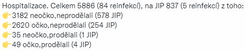 trend od 4.11. je snizovani dennich prirustku hospitalizaci - pokud to vydrzi a aktualni vlna behem dvou/tri tydnu zacne opadavat, pak bych rekl, ze svita nadeje, ze uz mame takove promoreni v kombinaci s ockovanim, ze zdravotnicky system uz celkem zvlada sezonni napor viroveho onemocneni. jsem zvedavy, jake prirustky budou tento tyden. podle statistk mame velke mnozstvi pozitivnich testu, ale taky nejvice testu za celou dobu testovani, ale taky pomerne velkou pozitivitu. snad virus zmutuje uz konecne do finalniho rymoveho stadia, ockovani + prodelani evidentne zabira. a jarni vlna uz bude mirnejsi