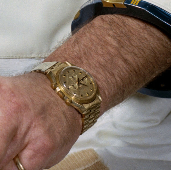 Ešte jedna hádanka: čo má na ruke Deke Slayton, bývalý administrátor NASA a big boss všetkých astronautov programu Apollo? Detail: