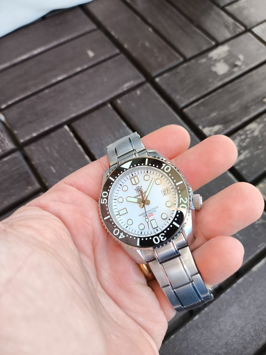 Predám krásne homage na Seiko mm300, ale so cifernikom bielym. Krásne monobloc puzdro, safirove sklo, ceramicka luneta a strojček automaticky Seiko NH35. Foto: Cena: 159 EUR vr. Packety