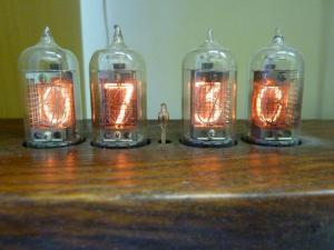 Tak přidávám do třetice - poslední a nejmladší můj kousek: Tentokrát jsou jako zobrazovací prvky použity digitrony Philips ZM 1040, výška číslic je úctyhodných 31mm. Digitrony se mi povedlo sehnat jednak přes inzerát a jednak od kamaráda ze starého čítače, elektroniku jsem nakoupil v "rozsypu" jako stavebnici od zde již zmiňovaného eshopu pvelectronics. Dřevěný sokl je opět práce mého dalšího kamaráda, který mi dělal sokl k předcházejícímu modelu... Za šera či tmy je to skutečný magnet pro oči