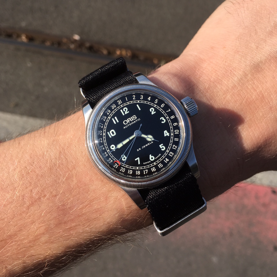 Akorát jsem je na letišti v Helsinkách viděl a hlavně vyzkoušel na ruce. A jako jo, nejsou špatný... jen ta velikost...ale to už jsme věděli podle parametrů z papíru. Moje zápěstí je pro představu cca 18 cm v obvodu a je vidět, že s těma nožičkama je to už na knap. 42 mm pouzdro je nakonec asi v pohodě ale ty dlouhé nožky to fakt kazí. Celkově působí takovým robustním dojmem. Zkrátka Oris 65, které jsem měl, byly pohodlnější a seděly líp. Vypíchl bych ale dobrý chod lunety (zřetelně klape a nevšiml jsem si žádné vůle) a pod přímým světlem se mi líbila ?zrnitá? textura ciferníku. Nejsou špatný a chvíli by mě možná bavily. Každopádně asi se bez nich obejdu Tady hnusný fotky přímo pod zářivkou, ale aspoň vynikne ta zrnitost cifru Z boku