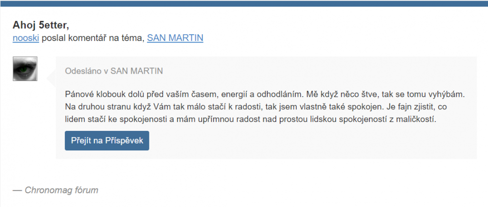 Ano, s tím souhlasím. Nejsme tady od toho, abychom se jen plácali po ramenou. Kritické komentáře třeba nejsou tolik příjemné, ale nepochybně mají v diskusi své místo. Nemám s tím problém, pokud to není ve stylu, kdy se odpůrci určitých hodinek slétnou na jejich majitele jako vosy na bonbón. Příklad z praxe ve vlákně San Martin: azeppelin: během pár hodin asi dvacet trollících příspěvků, ve kterých se neúnavně snažil rozpoutat flame a vyprovokovat čínomily k podrážděné reakci (zde nazýváno jako edukační činnost) - bez trestu nooski: jedna slušná reakce (viz níže) a hned ban na měsíc za trolling a flamewar a smazání vlákna Nemohu se zbavit dojmu, že se tady měří dvojím metrem, neslušné jednání odporující pravidlům (trollení) se odpůrcům číny přehlíží a u čínomilů je tvrdě trestána jakákoliv reakce.