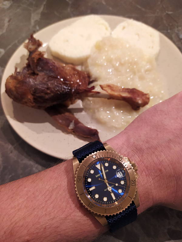 Když už je vlákno zase otevřeno, zapomeňme na proběhlou diskuzi a věnujeme se zase fotkám čínských hodinek. Dodatečně přeju všechno nejlepší svatému Martinovi. Oslavil jsem to se svatomartinskýma subama na ruce a fejkovou svatomartinskou husou (čínská kachna) na talíři. Omlouvám se za kvalitu - foceno čínským mobilem. -