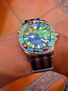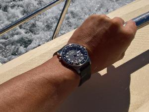 Taky jsem resil, jestli vzit drazsi nebo levnejsi hodinky, ale rozhodl jsem se neresit a vzit svoje Nr.1. Dal jsem je na gumu a uzivam si je od rana do vecera, ve vode pri plavani nebo na vyletech, denne ve slane vode a na slunicku. Bavi me to a hodinky to prezijou, jsou na to delany. Kdybych je nechal doma, jsem na tom stejne jako vsichni, co si koupi obrovskyho offroada a pak s nim jezdi na nakupy a na kafe. :-) Na stridani tu mam Nato, ale ani moc nestridam, libi se mi, ze vecer v restauraci vypadaj stejne jako odpoledne ve vode. Fotka z prvniho koupani s hodinkama na predchozim vylete.