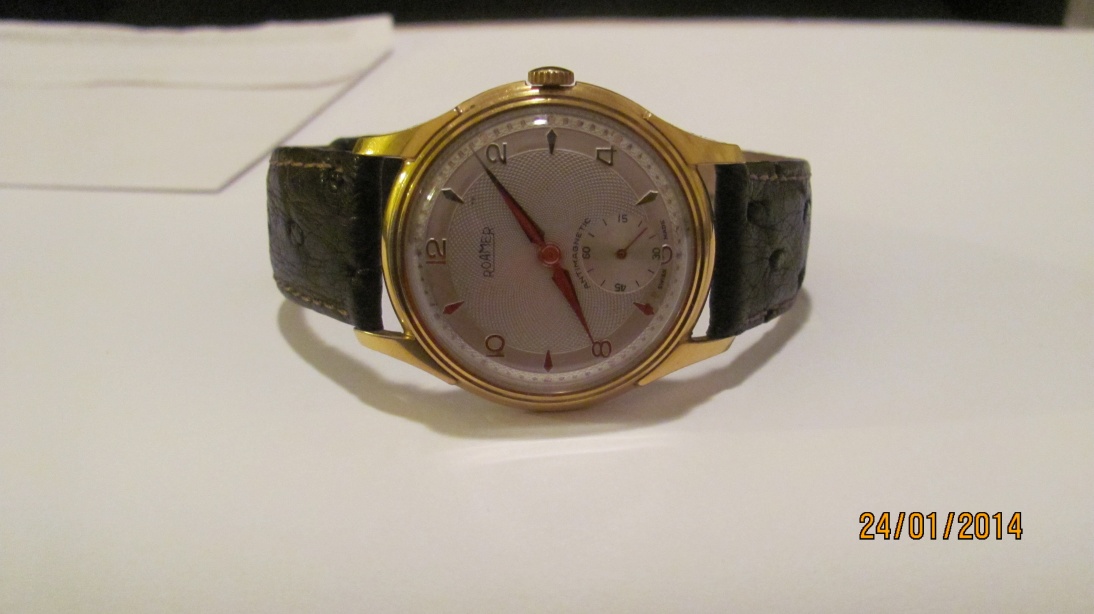 Ahoj, tak přidávám souhrn, co jsem vypátral ke svým Roamerům: Výrobce Mayer&Studelli. Kalibr MST 402. Průměr 30mm - z důvodu externí sekundovky na 6. Chronometrová třída, ve své době pravděpodobně zamýšleno jako konkurence k Omega30T/266. 15kamenů. Celkem unikát. Pouzdro ocel zlacená 12mikrometry, dno ocel. Antimagnetické. Gilošovaný číselník, sklíčko Plexi. Rok výroby cca 1950. Po kompletním vyčišttění a servisu - prosinec 2013. Momentálně na pštrosím řemínku KUKI. Jdou jak švýcarské hodinky. Další na http://roamer-watches.info/MST402.shtml Tak se mějte a dík. Příští týden jdu na další kousek - tentokrát Ancre, typ PRIMA.