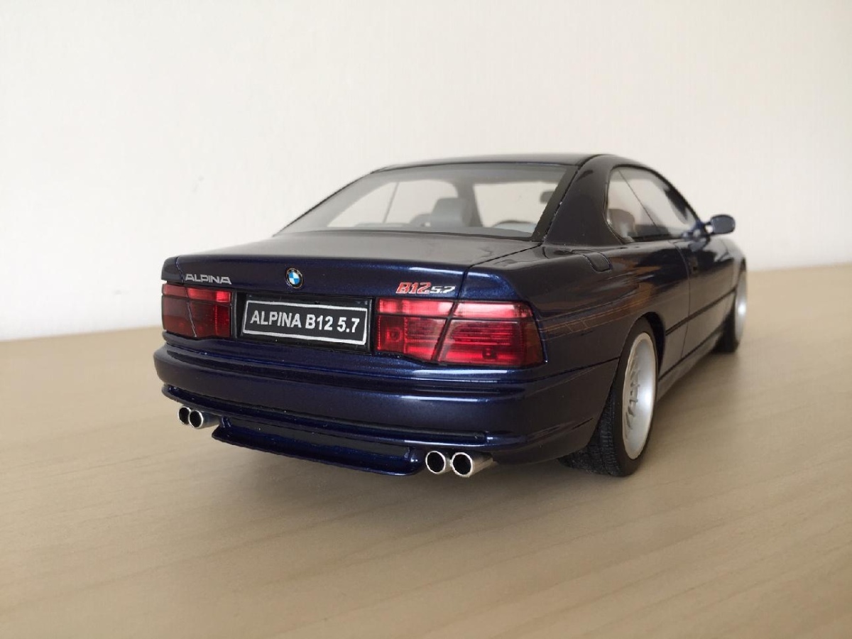 Alpina B12 5.7 v měřítku 1:18 od firmy OTTOMOBILE. BMW 850 CSi představovalo vrchol v nabídce řady 8 generace E31. Pokud někomu nestačila sériová Osmička, mohl si objednat vůz značky Alpina, který vznikal na jeho základech. Alpina B12 5.7 Coupe sice stojí na základech modelu 850 CSi, ale nikdy nevznikal jako dodatečná úprava hotového vozu, ale byl od počátku vyráběn v těsné součinnosti s automobilkou BMW. Motor a řada dalších komponentů přepracovaných u značky Alpina byla dodána na výrobní linku. Následně byl vůz dokončen v Buchloe, sídle firmy Alpina. Alpina B12 5.7 Coupe představuje hodně ojedinělý model, kterého se vyrobilo pouhých 57ks. Je to poměrně vzácný a exkluzivní zástupce první generace BMW řady 8, i když na první pohled se může zdát, že se od něj prakticky neliší. Na exteriéru byly provedeny opravdu minimální viditelné změny, to je pro značku Alpina typické. Nejvýraznější změnu vzhledu představuje kapota s řadou výdechů za výklopnými světlomety a vstupem NACA ve svém středu. Klasikou jsou zlaté pruhy na karoserii a kola v designu typickém pro značku Alpina. Hlavní změny se odehrály pod kapotou, kam zamířil vidlicový dvanáctiválec S70B56 se zvýšeným objemem z 5,6 l na 5,7 l a řadou dalších úprav. Disponoval nejvyšším výkonem 306 kW (416 k) a točivým momentem 570 N.m. Pro srovnání lze připomenout, že výchozí provedení tohoto motoru pro BMW 850 CSi nabízelo výkon 280 kW (381 k) a točivý moment 550 N.m.