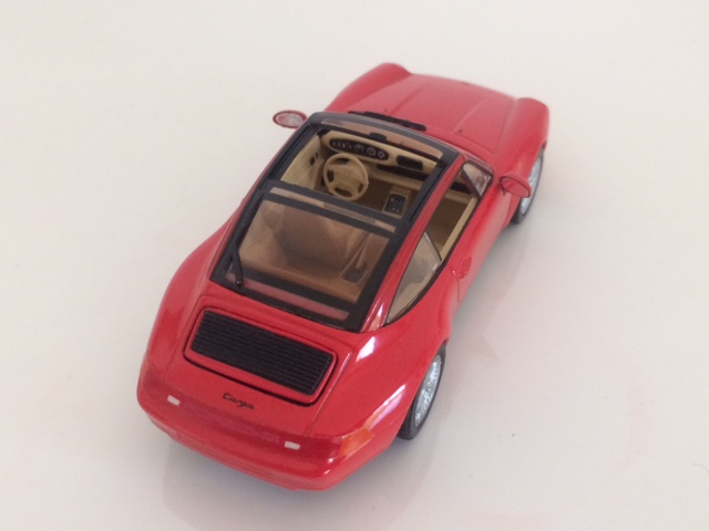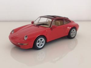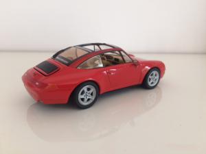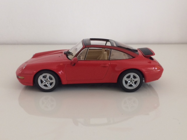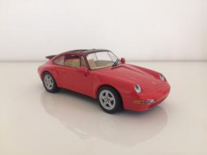 siwi : tak to NSU je moc povedený, Maxichamps jde do sebe a pouštějí do světa pěkné youngtimery. Myslím, že ho budu muset mít ve sbírce Poslední vzduchem chlazený model Porsche 911 byl představen v roce 1993 a nese kódové označení 993. Vyráběl se do roku 1998. Šestiválcový motor boxer má opět 3,6 litru a v základu má 272 koní. Zrychlení z 0-100km/h je za 5.4s, maximální rychlost je 275km/h. Po faceliftu naroste na 286 koní, přičemž při objednávce jste mohli za příplatek požádat o zvýšení na 300 koní.Vyrábělo se několik různých variant a specifikací. Jednou z nich je model Targa ,která se vyráběla od roku 1995 do roku 1997. Nemá už snímatelný panel s hliníkovým ochranným obloukem, ale velké posuvné prosklené střešní okno. Porsche 911 Targa v měřítku 1:43 od firmy Minichamps ze včerejší burzy. Model je zajímavý tím, že při posunutí(resp.jízdě vpřed)se samo vysune zadní křídlo. Při couvání se křídlo zase zasune.