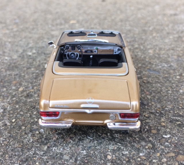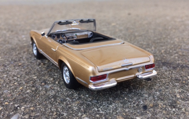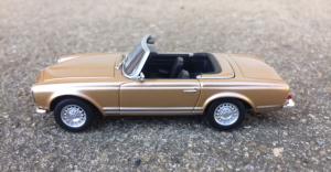 Nový přírůstek z minulého týdne, kdy jsem se zašel podívat do Černé Růže Mercedes-Benz 230 SL v měřítku 1:43 od Maxichamps. Mercedes 230 SL (W113) se začal vyrábět na jaře roku 1963 v Untertürkheimu (předměstí Stuttgartu). Řadový šestiválcový motor měl výkon 150 koní (110 kW), max.rychlost se blížila k 200km/h. Postupným zvyšováním objemu motoru vznikly ještě typy 250 SL a 280 SL. Po modelech 300 SL (W 198) a 190 SL (W 121) se v roce 1963 stal šestiválcový Mercedes 230 SL (W 113) třetím typem s označením SL, znamenajícím lehkou sportovní konstrukci. Označení SL vzniklo původně z německého ?sehr leicht,? tedy velmi lehký. Časem se ukázalo, že vozy SL nejsou až tak velmi lehké, začala firma Mercedes-Benz prezentovat tuto zkratku jako ?sport leicht.? Od začátku výroby se typ 230 SL dodával s plátěnou stahovací střechou nebo pevnou odnímatelnou střechou (hardtop). Při pohledu zepředu bylo na první pohled patrné neobvyklé konvexní zakřivení horní části rámu předního okna a z něj vycházející tvar pevné i plátěné stahovací střechy. Toto neobvyklé stylistické řešení se střechou nižší ve středu než na bocích dalo vozu přezdívku ?pagoda,? podle japonské (nebo také čínské) chrámové architektury s prohnutými střechami.