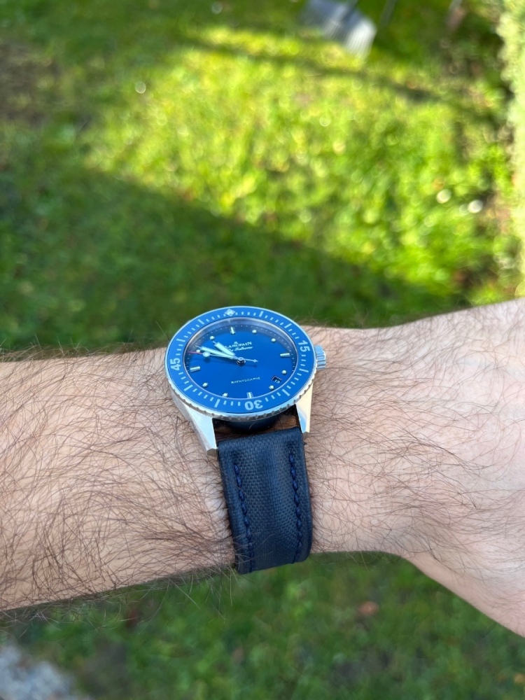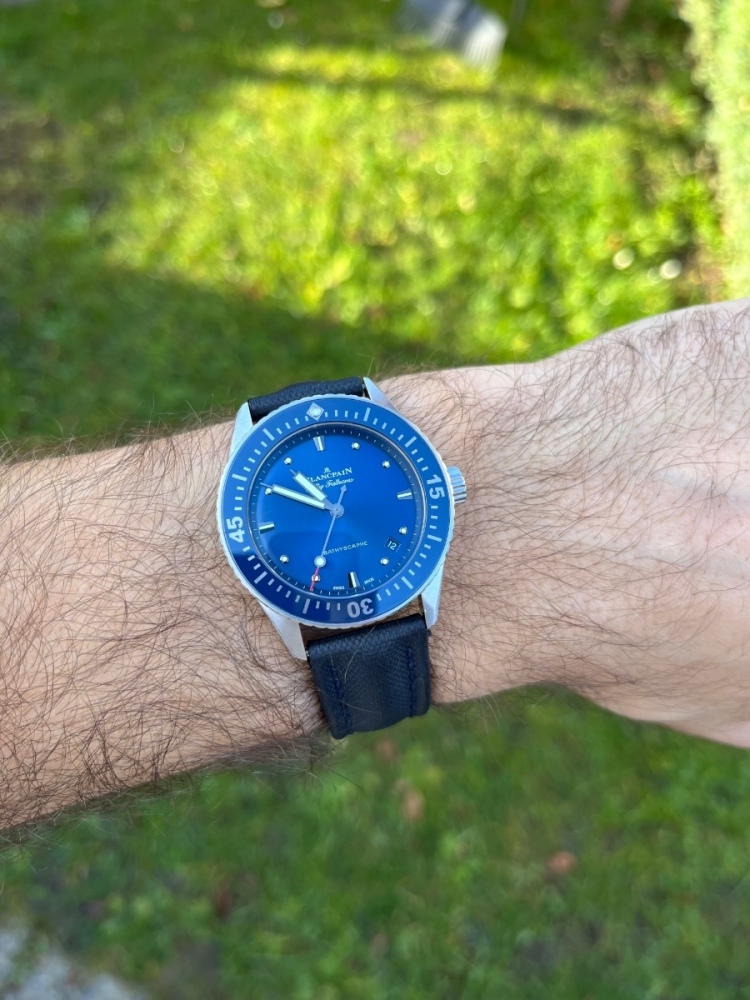 Ahoj, druhé, co se poslední měsíce témeř nedostanou na ruku jsou Blancpain Bathyscaphe 38mm (https://www.blancpain.com/en/fifty-fathoms/bathyscaphe-5100-1140-o52a). Hodinky z roku 2018, kompletní balení, původní sailcloth udělá ještě hodně parády (i proto, že je pekelně tuhý a ne moc dlouhý, tak historicky zřejmě nezažil moc nošení). 38mm velikost, 10.8mm výška, takže velice dobře nositelné hodinky. Nošené, což je snad vidět i na fotkách, malý zásek na pravé spodní nožce, Strojek 1150, který i při své velikosti má rezervu 100h, z čehož by se mohl nejeden výrobce inspirovat. Nějakou jeho variantu používali i Breguet, VC, nebo AP, takže už trochu vyšší hodinařina. Před necelými 2 lety na servisu v Onyxu, od té doby na ruce sporadicky. Krabice, ve které je peli case, ve kterém je transportní pouzdro, se blíží rozměry krabici na Speedmastery, takže jen osobně v Praze, tyhle se mi vážně posílat nechtějí. Cena: 160k (vyšší hodinařina, za cenu ocucaných subů )