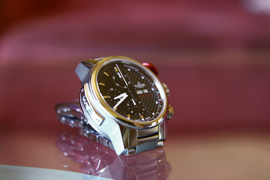 Tak konečně jsem se dostal k tomu je nafotit. Vím, že EDOX není zrovna repre značka, ale mě jako fun hodinky udělaly radost. Ještě k nim časem zkusím sehnat origo gumu. Mám je už třetí týden a jsem maximálně spokojený. Za 20 dní jsem od prvního nastavení na +6 s. Jinak je to opravdu masivní kousek, asi by se daly použít v případě nutnosti i jako boxer . Budu muset začít nosit něco těžkýho na pravý ruce, abych to vyvážil a taky posiloval rovnoměrně obě ruce. Zpracování je perfektní. Tah je ze solidního nerezu, žádnej motanej plech. Spona jde velmi lehce, ale při tom je dobře zajištěná. Překvapilo mě, že ta spona je opracovaná z jednoho kusu kovu. Např. starší Omega tah má trn na sponě bodově přivařený, tady je to CNC opracovaný jeden kus. Na fotkách není vidět 3D efekt použitého karbonu na ciferníku. Jo, to červený tlačítko, kdyby jste se chtěli ptát, je spouštění autodestrukce! Tím spodním se nastavuje její časování. Na stopkách se mi líbí, že minutovka skáče. Nepohybuje se rovnoměrně pomalu, ale když stopková vteřinovka přejde přes dvanáctku, minutovka poskočí. To mě trochu překvapilo, protože stejný Valjoux 7750 na Tissotech posouvá minutovku pomalu a rovnoměrně bez přískoků :-) Za cenu, kterou jsem za ně zaplatil, jsou naprosto perfektní. Poměr cena/výkon je v mých očích excelentní.