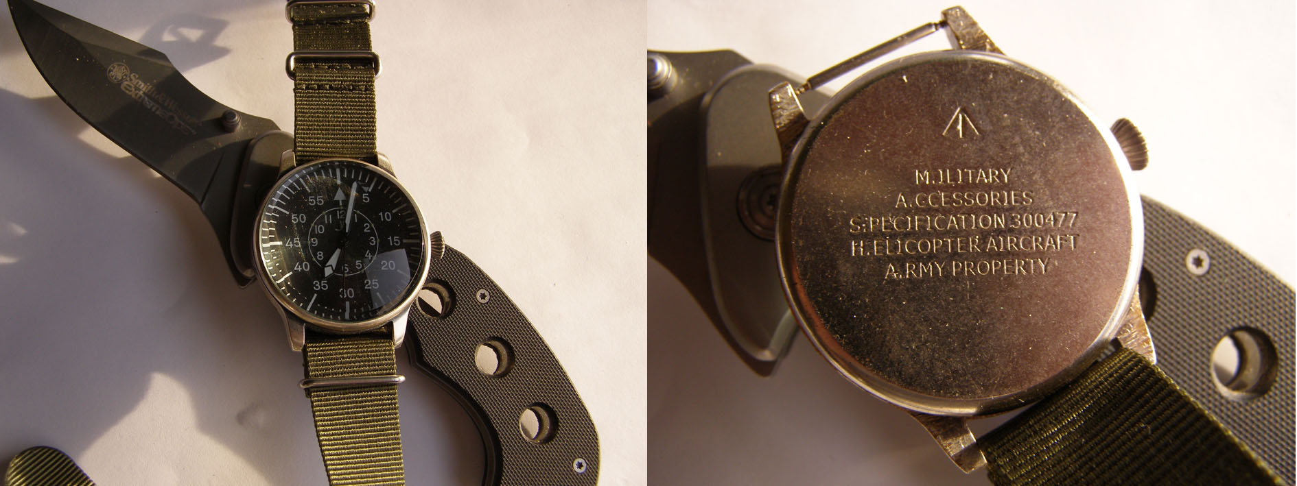 Tyhle hodinky jsem koupil velmi levně v aukci (jsou to quartzky) průměr bez korunky 42 mm. Pouzdro a korunka vypadají starobyle. Vypadá to na čínský plagiát, ale také by to mohla být předělávka starých hodinek. Na ruce vypadají větší než Archimede Pilot stejného průměru, které běžně nosím. Ten znak na ciferníku mi připomíná nějaké ruské hodinky, jen si nemohu vzpomenout, byly to nějaké aviatory (GLASHUTTE to pochopitelně nejsou).