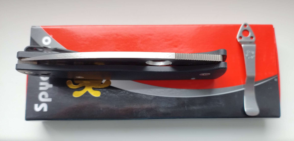 Ahoj. Prodám používané Spyderco Bodacious, chvíli jsme ho nosil a používal (hlavně na kancl svačining), ale nějak jsem se nesžil s touhle pojistkou....Jinak je to skvělá kudla. Dal jsem mu černý deep carry clip, aby tolik nevyčníval z kapsy, originál klip samozřejmě přikládám viz. foto. Nůž jsem asi 2 x ostřil, na čepeli se nějaké vlásečnice najdou, vyfotit mi to nejde. Tady komplet popis: Bodacious Cena 4900,- Kč i s poštou. Díky Bertovi za prostor k inzerci.