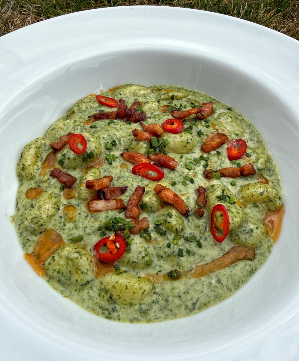 Grilovaná vepřová panenka s maldonem, růžičková kapusta, omáčka z medvědího česneku, bramborový fondán, pancetta. Skoro by to spíš páslo na zelený čtvrtek, ale holt mi to vyšlo takhle.