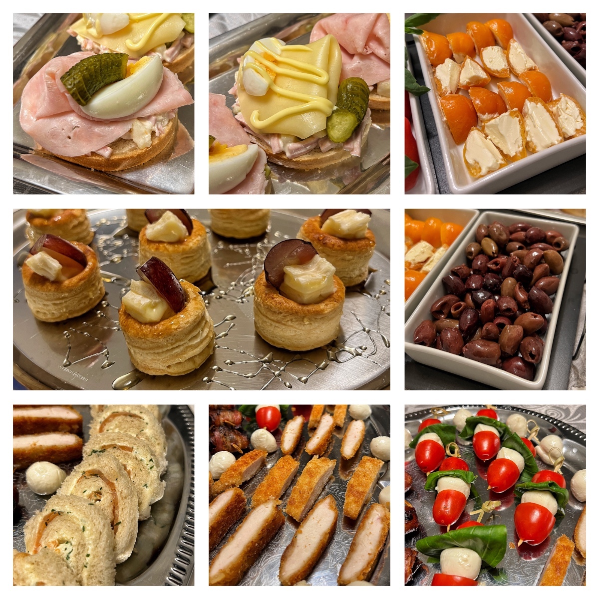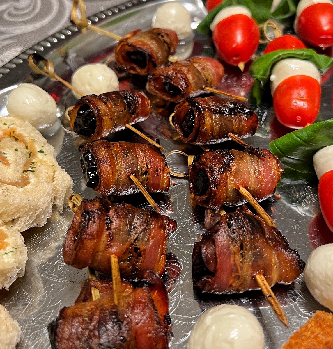 Ehm. Easy Koupit hotové listové kanapky — už nevim kde, myslim Lidl. Dopéct na 200st. / 10min. Nechat vychladnout. Výraznější Camembert nebo jiný smradlák s ušlechtilou plísní. Hroznové víno bez pecky. Pár kapek medu. Voala. Jo a na koláž mi unikly sušené švestky obalené ve slanině a zapečené v troubě. Dělal sem prvně a pecka!