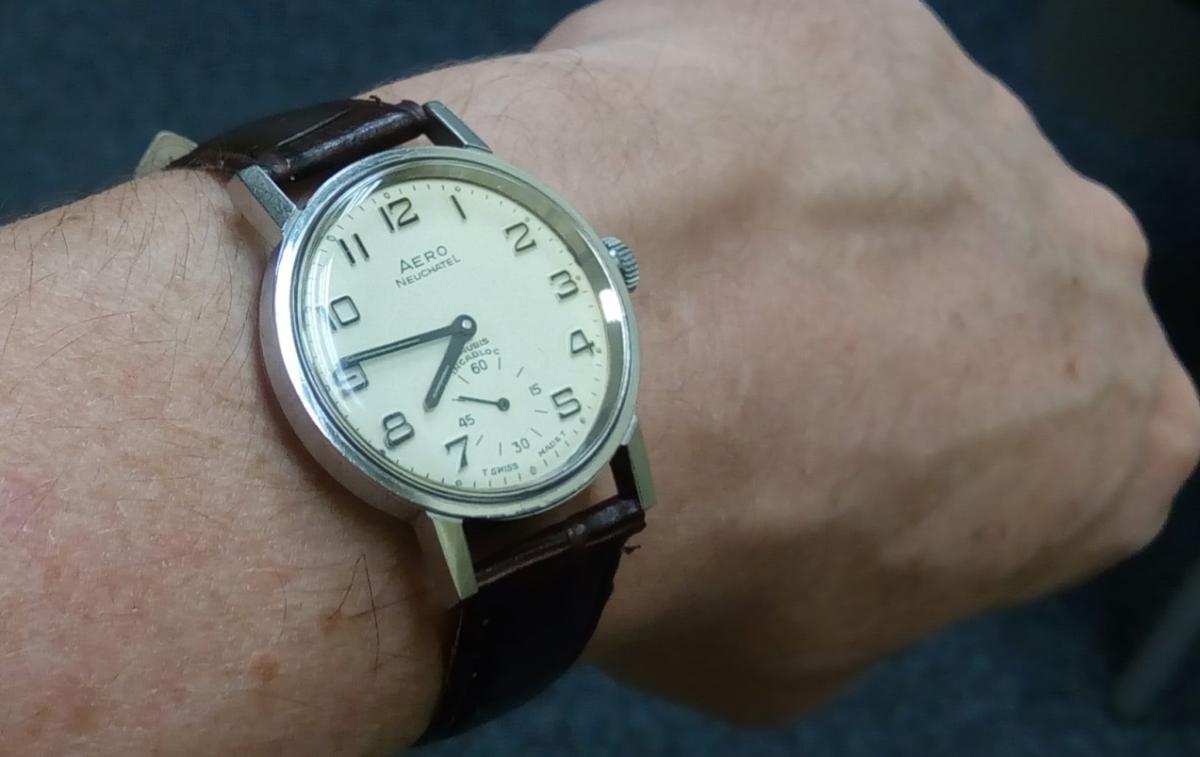 Když se blíží ty vánoce, tak ještě jedny trochu méně obvyklé - Aero Neuchatel, dnes AeroWatch, s ručně natahovaným Unitas 6325, pouzdro nerez. Stáří se dá asi jen odhadnout, sice na dýnku je sériové číslo, ale zatím jsem nenašel žádné tabulky apod., podle nichž by se dal datum výroby zjistit. Není to žádný zázrak hodinářského průmyslu, ale čistokrevná poctivá mechanika, hlasitě tikající už několik desítek let.
