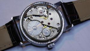 Průměr je rovných 35 mm bez korunky. Strojek vyplňuje pouzdro téměř beze zbytku, má průměr zhruba 30 mm. Co jsem se o strojku dočetl, tak právě jeho větší rozměry jsou důvodem jeho robustnosti, stability chodu a slušné rezervy nátahu.