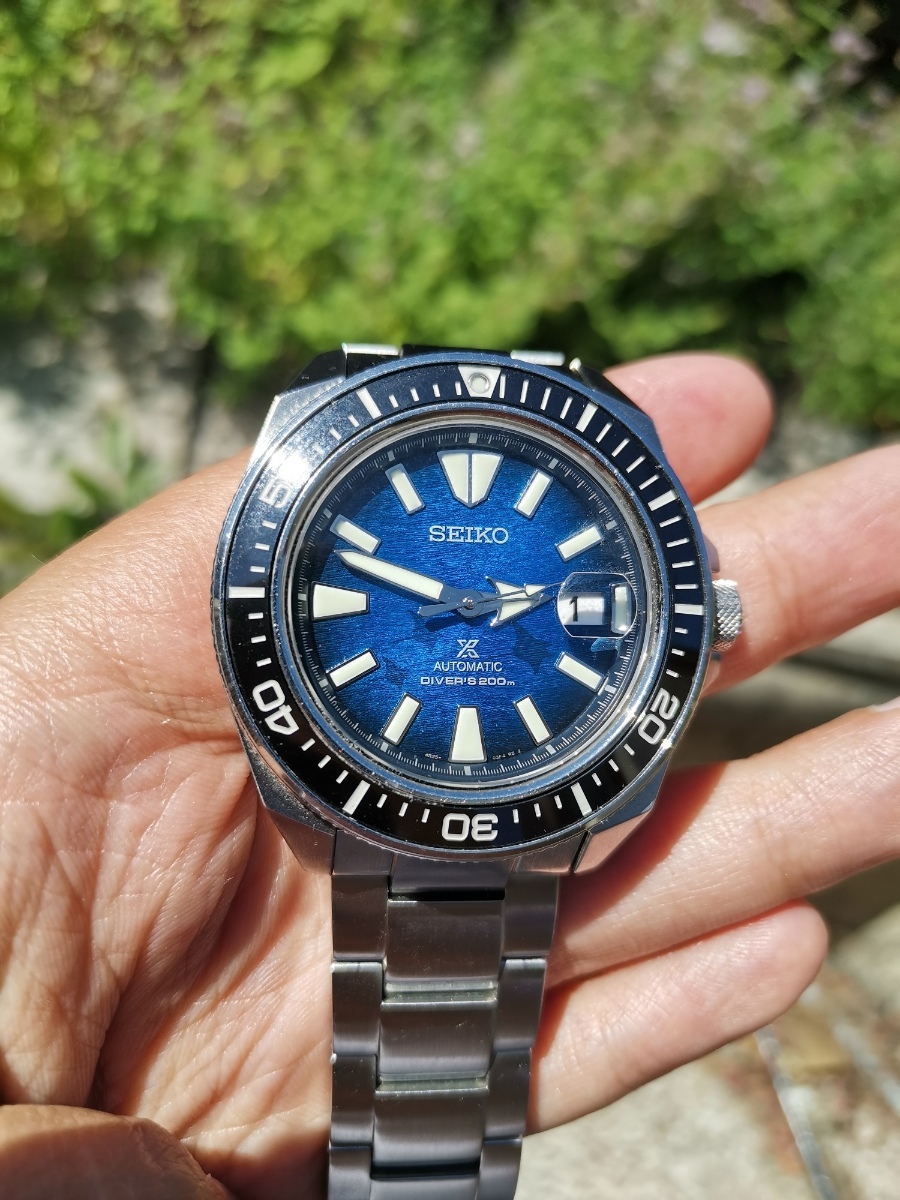 Speciální edice Samurajů – tři Manty zachraňují oceán. Super čitelnost díky kontrastu ciferníku a indexů, lumi indexy a ručky svítí i přes den, krásný strukturovaný ciferník, pod úhlem na slunci se umí zatřpytit jako hladina na moři a díky 200m WR se vody určitě neleknou, velikost prý přes 43mm ale sednou bez problémů na menší ruku, kyklop zvětšuje, přesnost mi udělaly po korekci v Jihlavě +5s/den. Celkově výborný stav, hodinky z roku 2023, jenom drobné známky nošení (vlásečnice na náramku). Komplet balení, papíry, navíc i guma a NATO pásek. Víc info na https://www.chronoshop.cz/seiko-srpe33k1-prospex Cena: 12 000 Kč i s dopravou
