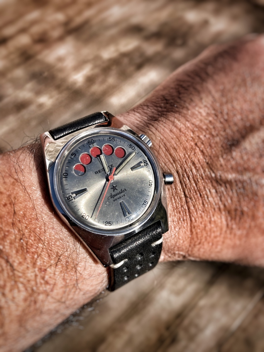 Trochu jsem to “zdramatizoval”, aby vynikl ten přesvícený ciferník. Regatová chrona od Aquastar ze šedesátek ️