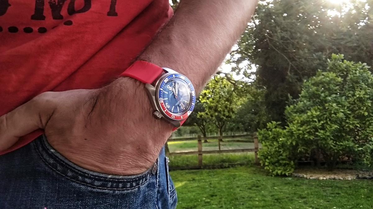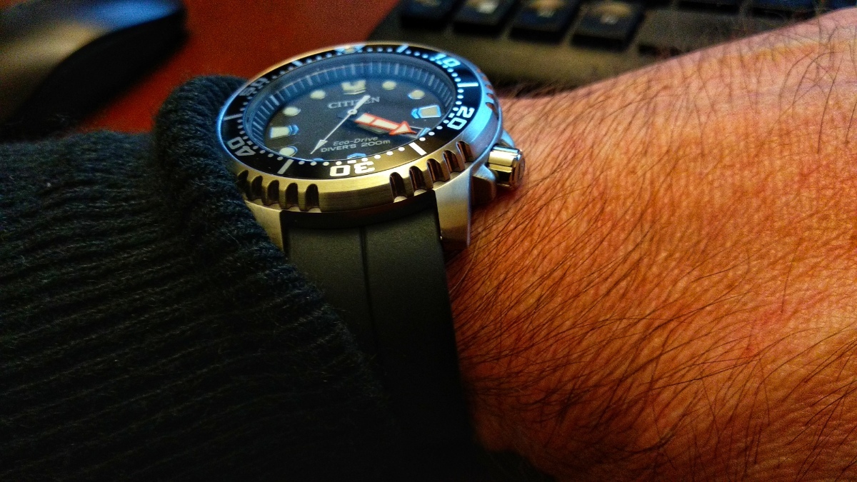 Tak hlasim, ze jsem si koupil ty BN0150. Jelikoz jsem tak trochu prukopnik slepych ulicek, a vzdycky se zakousnu do nejakeho napadu, ktery mi zrovna proletne hlavou, tak jsem si umanul, ze nejak poresim gumovy pasek s tvarovanymi koncovkami. Mam proste obdobi, kdy mi mezera mezi pouzdrem a paskem vadi. Nikde jsem nenasel zadny relevantni odkaz nebo informaci, takze holt naslepo a po hlave. A svete div se, hned prvni objednany pasek pasoval naprosto dokonale. Na jedne te fotce to trochu vypada, ze tam je mezera, ale neni, ani pul milimetru. Je tam stin, protoze pouzdro je pochopitelne vyssi nez tloustka pasku. Mne se to tahle libi, a je to pohodlne. Tenhle pasek je tvarovany tak, ze hned od pouzdra se zacina tvarovat kolem zapesti. Vazne dobry. Tak kdyby nad tim nekdo uvazoval, jde to