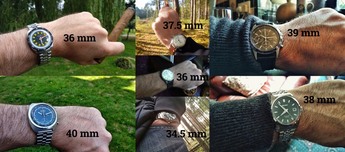 No urcite zalezi na obvodu zapesti. Ja mam obvod zapesti asi 17.5 - 18cm (podle toho, jak je venku teplo) a "malych" hodinek jsem se uz davno prestal bat. Velikost pouzdra je asi jako Saiko SARB033, a ty jsou prudce nositelne (pro me). Vim, ze uz jsem to daval jinde, ale s dovolenim to hodim jeste sem... ciste jen jako referenci. (A vzdycky rad poukazu zvlast na ALBA APBT207, dole uprostred. Papirove nejmensi, citelnosti nejlepsi z tehle kolaze, bez debat. (A uz mlcim, vazne to nechci tapetovat. Jen chci poukazat na to, ze velikost pouzdra muze byt dost zavadejici udaj. A zrovna Captain Cook mi pripada dost dobre citelnej kousek.)