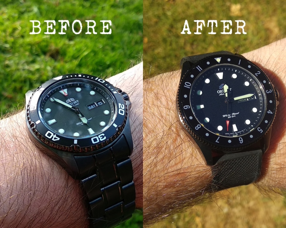 Pojedu na dovolenou, tak jsem urychlil zamyslene upravy. Ray 2, tzv. "Havran" (Raven) jsou prima hodinky za hodne malo penez. Ale ta luneta, ta luneta. No nic, mel jsem nastesti doma asi uz 7 roku safir na Seiko Sumo (vymenu jsem nikdy neuskutecnil), a jsou to nastesti rozmery, ktere presne sedi na tyhle Orienty. Potom uz jen lunetu (ocelova verze se da sehnat lehce, PVD verzi ma podle me jen DLW Watches v Singapuru), vlozku lunety na pocitani piv, a je hotovo. Jo, a malem jsem si urizl palec, teda, ta origo luneta tam nema moc mista a ja mel pouzivat mensi nuz. Ale uz jsem zamackl slzy, dal na to naplast, a delam ze nic... Za to "predtim" a "potom" v Anglictine se omlouvam. Jsem na to uz prilis navykly, a uz se mi to nechce predelavat.