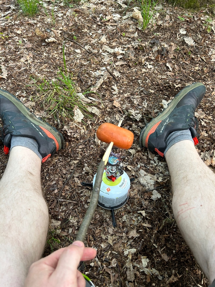 Opravdu jsem si ho opekl nad vařičem. Měl jsem špekáčky, protože byl v plánu oheň. Jenže jsme tábořili na místě kde jsme na sebe nechtěli upozorňovat ohněm. Takže v nouzi jsem to vyřešil takto. Plynové grily fungují stejně.