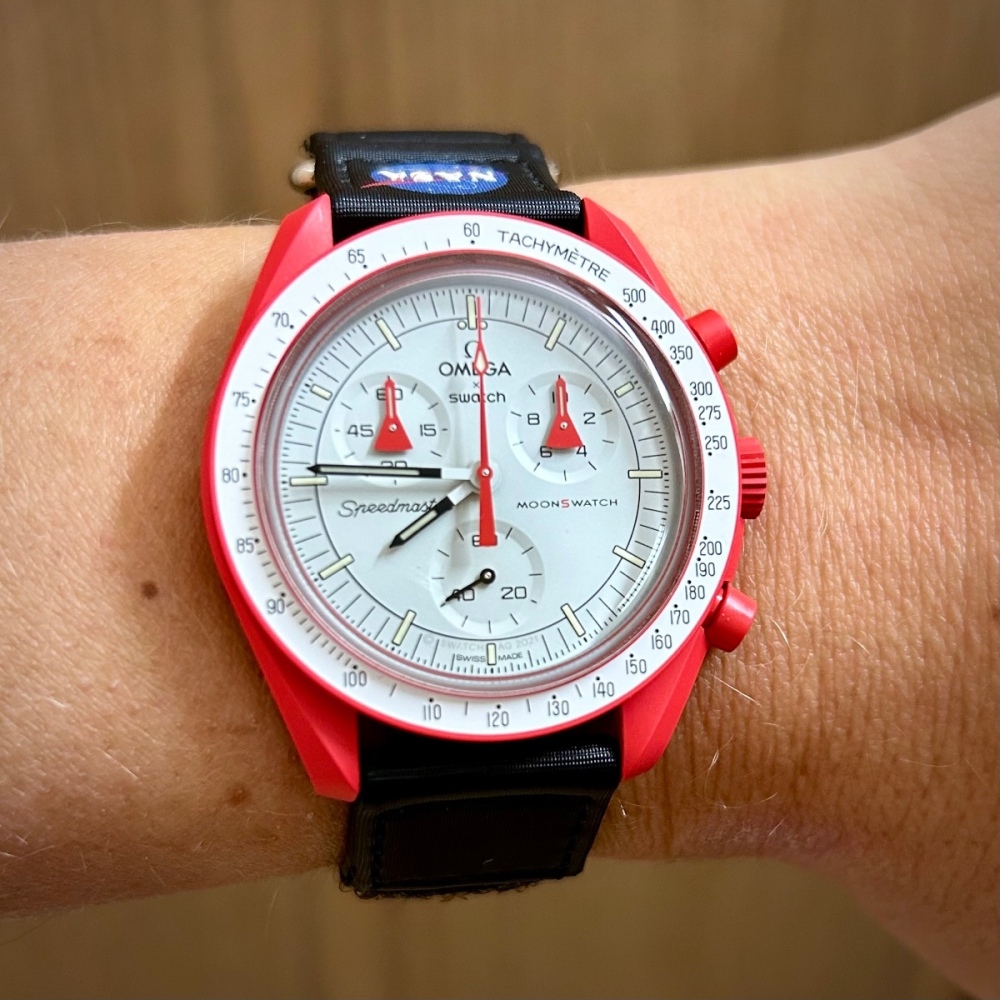 Pořídil jsem Marsy, jak píše kolega výše - jsou na ruce hodně příjemné. Origo velcro šel dolů a nasadil jsem černý moonwatch velcro. chtěl jsem právě Marsy díky spojitosti s Alaska project designem. Musím říct že barevně odlišení ruček na chronu a časomíry hodně pomáhá čitelnosti. Červená na černém řemenu zas tak moc neřve…