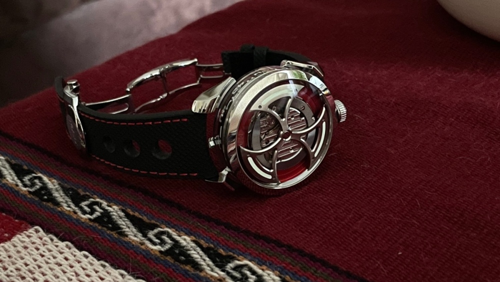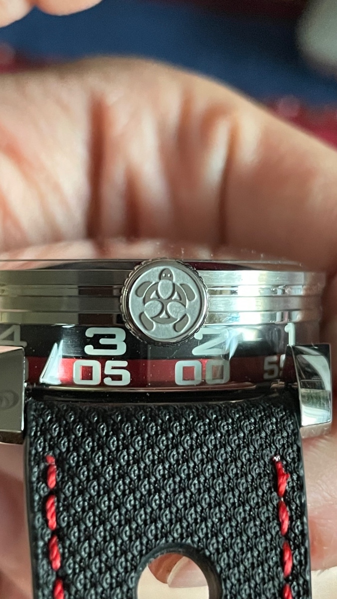 Jo, ta vrtule je rotor. Strojek je Miyota s jednostranným nátahem - takže vrtule se volně točí jako fidget spinner. Strojek je tedy vzhůru nohama a čas se indikuje pomocí dvou cylindrů na straně pouzdra. Na pouzdře není patrný ani jeden šroubek, nebo závit nebo nic co by indikovalo jak to drží pohromadě. na korunce (bullhead = na 12hod) je vyobrazená želva, což je de fakto tvar hodinek. Nožky jsou nohy, pouzdro je krunýř, indikátor času je ocas a korunka je hlava. Kovová konstrukce pod skleněným válcem pouzdra to jenom podtrhuje. Max Büsser se vyřádil!