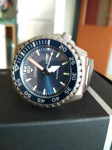 Pamatuji si, že poprvé jsem zaregistroval hodinky svého kamaráda, byly to chrono automaty Tissot. Byl jsem okouzlen zpracováním a samozřejmě automatickým strojkem. Přibližně po půl roce, nastal čas Vánoc a já jsem ve svých ještě pubertálních letech dostal jasný úkol, vybrat si dárek k vánocům. Věděl jsem, že to budou hodinky, ale vůbec jsem nevěděl jaké, absolutně jsem se nevyznal v přehršle modelů a specifikací. Vybral jsem si své první v mých očích ?pořádné hodinky? módní Jacques Lemans, quartz, s datumovkou a s vteřinovým sub-ukazatelem. Byl jsem nadšený a dlouho jsem je nosil bez nějakého dalšího zájmu o hodinky. Uběhly asi dva roky a já narazil na Chronomag fórum. Vzápětí se vše změnilo. Nekonečný přísun informací, nekončící zástupy značek a modelů. Po čase jsem věděl, že automatické hodinky musím mít. A musí to být potápky. Můj rozpočet nebyl nijak veliký, až jsem na konec v jednom hodinářství v Jihlavě narazil na novinku od Citizenu. Samozřejmě je už mám na ruce. A teď k recenzi. Hodinky disponují průměrem pouzdra 46mm a výškou 12,5mm. Pouzdro i tah jsou z masivní oceli s kartáčovanou úpravou. Dýnko je šroubovací, neznačené. Váha celého kompletu je 174g. Neznačená korunka je na ?čtvrté? pozici a není šroubovací. Sklíčko je ploché minerální, luneta jednosměrně otočná, 120 kliků. Ručičky i indexy pokrývá silná vrstva SuperLuminova. Uvnitř hodinek bije Miyota 8200 s 21 kameny, frekvencí 21600 půlkmitů za minutu, komplikací day/date a ručním nátahem, bohužel bez hackingu. Udávaná vodotěsnost je 100m. Na první pohled hodinky zaujmou svojí velikostí, která mi ovšem na moje 18,5cm zápěstí přijde akorát. Co mě opravdu dostalo, je nádherný tmavě modrý ciferník s bílými plastickými indexy, který na slunci předvádí koncert všech odstínů modré, skoro od tyrkysové až po ocelově modrou. Čitelnost je i přes absenci antireflexní úpravy minerálního skla skvělá, díky jednoduchosti celého ciferníku a také díky oranžové minutové a vteřinové ručičce. Nemám problém odečíst čas a datum za jakékoliv situace, a o to mi hlavně šlo.Luneta je v tmavě modré barvě a koresponduje s ciferníkem, a ač je plechová jde hezky ztuha, krásně cvaká a nemá tendenci se sama posouvat z mnou zvolené pozice. Okraj je příjemně vroubkovaný a zajištuje tak stabilní úchop bez jakéhokoliv řezání nebo tlačení do prstů. Nešroubovací korunka na ?čtvrté? pozici je nesmírně pohodlná, mám zvyk nosit hodinky hodně u zápěstí a i při této velikosti mě netlačí ani při celodenním nošení. Tah 22 mm ač základní, ocelový, se značenou překlápěcí sponou je velmi příjemný, ale stále přemýšlím o koupi nějakého pěkného ?shark mesh?. Škoda, že si výrobce více nepohrál se šroubovacím dýnkem, obsahuje pouze základní údaje a není nijak zdobené. Hodinky nosím celý den, nesundávám je ani na koupaní, většinou ani na spaní, akorát na manuální práci, protože leštěná spona je magnet na mikro škrábance. Překvapila mě kvalita zelené lumi vrstvy, po běžném nošení svítí velice dobře a čas je odečitatelný i ráno. Přesnost jsem nesledoval, jdou lehce do plusu, ale to mě popravdě moc nezajímá, nepotrpím si na přesný čas, tak jako na ?tikající duši?. Několikrát jsem se s nimi koupal, v rybníce i v moři, vzal je na výšlap do 2000m.nm. Fungují naprosto bez problémů. Jako hlavní nevýhodu vidím absenci safírového skla a spíše základního strojku bez ?hackingu?. Uvítal bych i alespoň drobné značení korunky a dýnka, ale to bych chtěl za ty peníze asi moc. Ani po dvou měsících nošení mě nijak neomrzely, stále se na ně rád dívám a rád je nosím, ale už teď vím, že u nich rozhodně neskončím. + nádherný modrý ciferník +velmi silná lumi + pohodlné na ruce -základní strojek bez hackingu -neznačená spona a dýnko -absence safírového skla Snad se Vám bude mojeprvní recenze líbit, fotky jsem lepší nevyplodil, teprve se snažím přijít na to, jak je vlastně fotit.