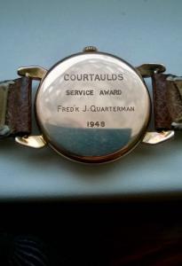 Lakonické gravírovanie prezrádza, že boli venované v roku 1948 zaslúženému pracovníkovi spoločnosti COURTAULDS, podľa internetového prieskumu to bol najväčší výrobca textílii pre domácnosť a priemysel vo Veľkej Británii a neskôr v celej Európe až do roku 1990. Pravdepodobne ide typický starosvetský "retirement" present, zlaté hodinky do dôchodku.