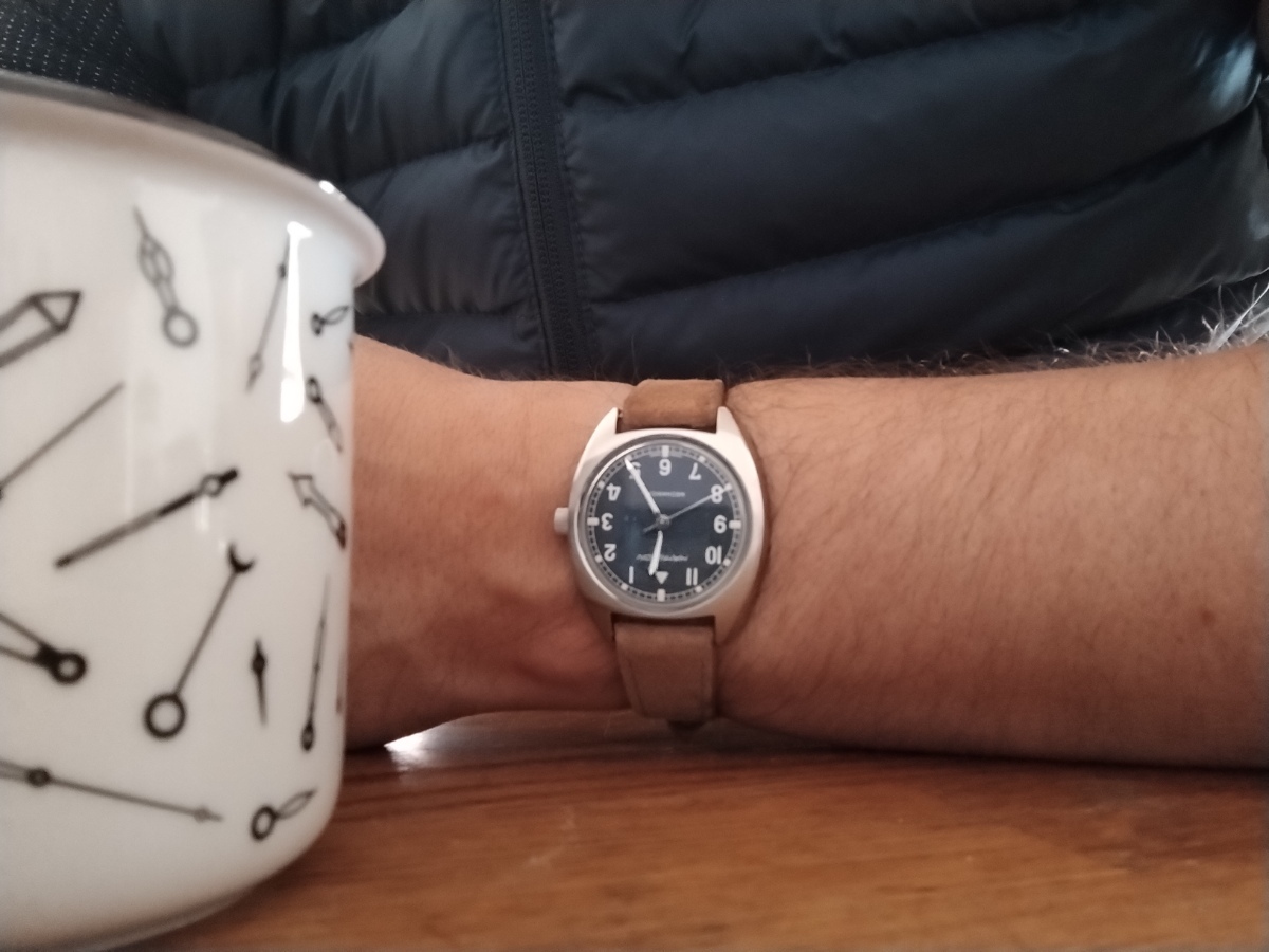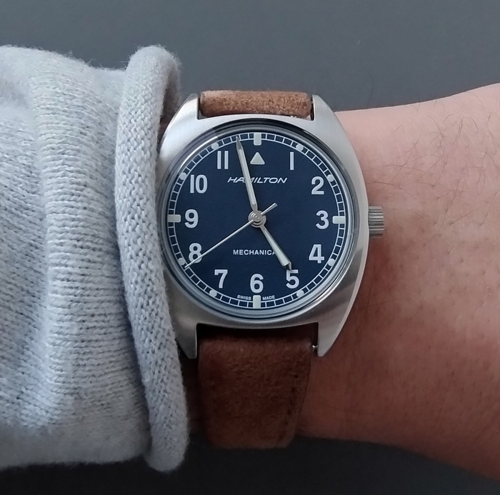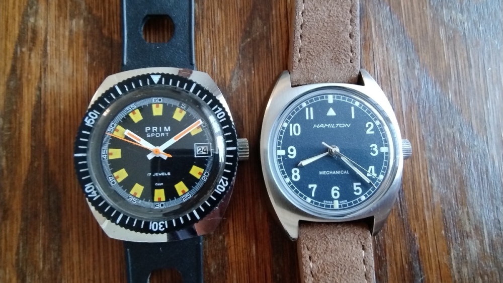 Debata v příslušné vlákně o malých hodinkách mě navedla k tomu popsat pocit z nošení hodinek s pr. 36mm. Byť se postupně velikost nově uváděných hodinek zmenšuje, často budí tento rozměr pochybnosti a obavy. Zápěstí mám podle stavu nafouknutosti 17,5 - 18cm - na fotkách, které pořizuji většinou makro objektivem z blízkosti působí hodinky o něco větší, než jak působí reálně. Rozměrově lze pocit z hodinek přirovnat k referenčním PRIM Sport 2 - dojem z nošení je taky podobný. Hamiltony mají lehce prohnutý profil pouzdra, přisednou tak na zápěstí, díky čemuž působí ještě tenčí dojmem než Primky - pohodlí je maximální. Kdo potřebuje mít na zápěstí hodinky, které překryjí celou ruku asi nebude mít z Hamiltonů ten správný pocit. Každý kdo zkusil hodinky podobných rozměrů jen krátce, kdy si je nasadil místo svých hodinek pr. 43mm musí mít pocit že se jedná o dámský model. Trvá chvilku - cca jeden den na zápěstí, aby se člověk s tímto rozměrem ztotožnil, hlava vymaže tu potřeba srovnávat si rozměry s většími hodinkami, přijme ten rozměr jak standard a pocit malých hodinek mizí. Najednou zůstává jen pocit velkého komfortu - hodinky se vlezou pod rukáv, nikde netrčí, jsou příjemné, lehké, pohodlné. Následně se pak zase přechod zpět na větší průměry jeví jako cesta do pravěku "maskulativních" zbytečně těžkých cibulí... V rotaci na ruce mám nyní Hamiltony v 36mm, OS Divery a RADO Cook s 41mm a EPOS Chrono Pilot se 43mm a jsem schopný na svém zápěstí unést všechny velikosti bez pocitu malé / velké. Není to ale pro každého a u hodinek je právě ta radost z nošení a pocit pohodlí klíčový - jestli to pro někoho znamená hodinky které jsou komfortní, byť menší než je průměr, nebo naopak kus oceli, je jedno.. Tak ať Vám hodineky dělají radost a neposuzujte rozměry hodinek letmým vyzkoušením ale chvilku je ponoste samostatně v kuse... Foto z blízka : Nepovedené foto alá ATOM - názorně ukazuje velikost s odstupem: Srovnání s Humberty: -