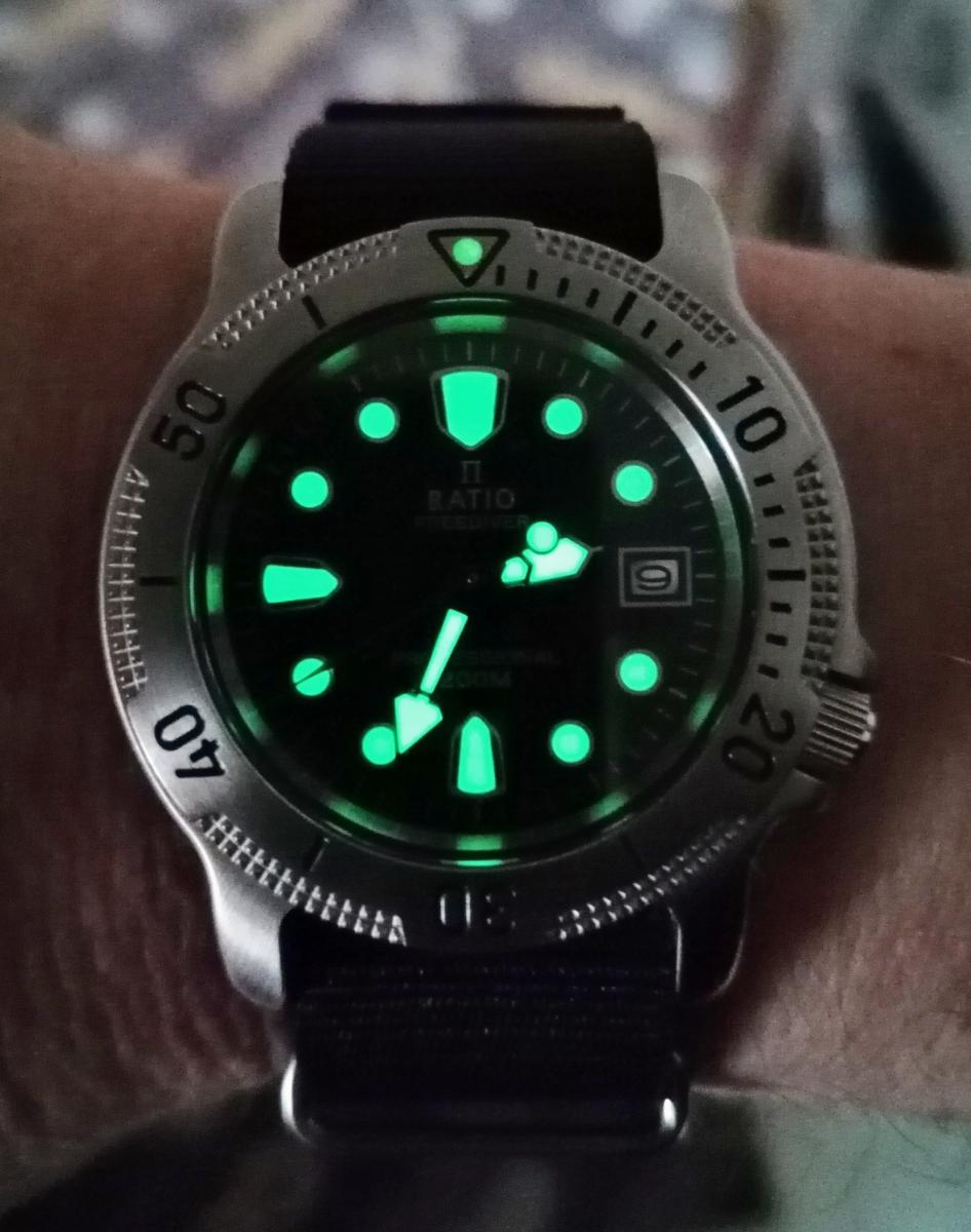 Ratio ll freediver profesional. Za 69 euro pěkné hodinky, tiká tam snad něco od Seika. Vteřinovka skáče po indexech. Šroubovací korunka, nerez pouzdro, safír, bez korunky 43 mm průměr. Gumový řemínek je strašně dlouhý a tuhý, vyměnil jsem ho za hadr. Krásná lumi, která vydrží celou noc. Koupil jsem je ze zvědavosti a jsem překvapen poměrně kvalitním zpracováním.