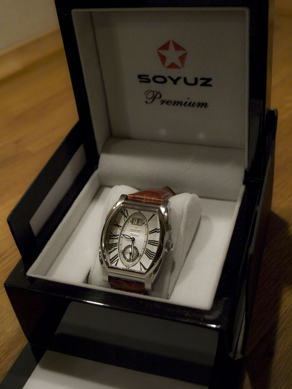 Po prodeji Parnisů jsem přemýšlel co bych vzal na ruku dále. Dlouze jsem přemýšlel o Archimede Arcadia, které mi přisly jako moc příjemná "náhrada", ale vadilo mi, že modro/bílá kombinace nemá modré indexy. Tak jsem zapl eBay a prohlížel prodejce, u kterých jsem už něco koupil. A nakonec jsem narazil na Soyuz "Complications Quadro". Na fotce se mne upoutaly hned, na druhou stranu mne ale odrazoval tvar, na který jsem nebyl zvyklý. Jenže nad hodinkama jsem přemýšlel i den na to a tak jsem si je večer koupil. Původní cena byla 7 000 Kč s poštou v přepočtu, v Best Offer jsem je ale "usmlouval" na 5950. Dorazily opravdu pečlivě zabalené z Litvy se záruční kartičkou a úplnou daňovou fakturou. Nejlepší část balení byla černá papírová krabice a uvnitř leštěná černá dřevěná. No a v ní schovaný můj nový pokládek - hodinky samotné pečlivě olepené několika vrstvami plastových nálepek. V přiloženém letáčku se píše o dlouhé historii hodinek pro elitu Sovětského Svazu. Slíben mi byl zároveň přetisk plakátu Stalina s hodinkami Soyuz. Vzhledem k tomu, že se spíše snažím zorientovat, tak to beru s rezervou, tatík se však zmínil, že jeho kolega měl kdysi Soyuz se švýcarským strojkem. Tak doufám, že opravdu budou tak spolehlivé, jak všude píší. K vlastním hodinkám... Tvar pouzdra je masivní, proto mne překvapuje uzounký, 20mm pásek - jedna z věcí, co mne na nich mrzí. Myslím, že 22 by jim vůbec neublížila a vypadala by mnohem lépe. Hrany jsou hladké, neřežou, nenašel jsem na oceli jediný kaz, škrábanec nebo cokoli, co by se mi nelíbilo. Sklo je zapuštěné, dobře broušené, též bez ostrých hran a s jemným přechodem, Ciferník je přehledný, což byl hlavní požadavek, jen tak se neokouká zejména díky pěkným indexům. Těmi jsou ručně nanášené římské číslice. Luminiscenční barva je nanesena na ručičkách a vydrží při plném vystavení světlu až 7 hodin. Hodně dobrý dojem na mne udělal velký ukazatel data na dvou samostatných kotoučích, který se přecvakává pomocí tlačítka nad korunkou. Ta je dvoupolohová, sloužící pro natažení a seřízení času. Strojek RP 2852, samonatahovací, 20 rubínů, opravdu velmi přesný - poprvé sice udělal +25 sec za hodinu, teď se ustálil na +23 za týden. Jen ho vůbec není slyšet tikat. Přes spodní průhled vidím strojek, mimostředová vteřinovka se krásně plynule posouvá, ale opravdu nikde ani tik, ani ťak... Pásek je, jak jsem již napsal 20mm zužující, na konci ukončen překlápěcí motýlkovou sponou. Myslím, že ho brzy vyměním, imitace ještěrky se mi moc nelíbí, asi tam dám teletinu... koketuju s myšlenkou dát to na pásek s podložkou. chvíli po vybalení kuk na ně no nejsou krásný?