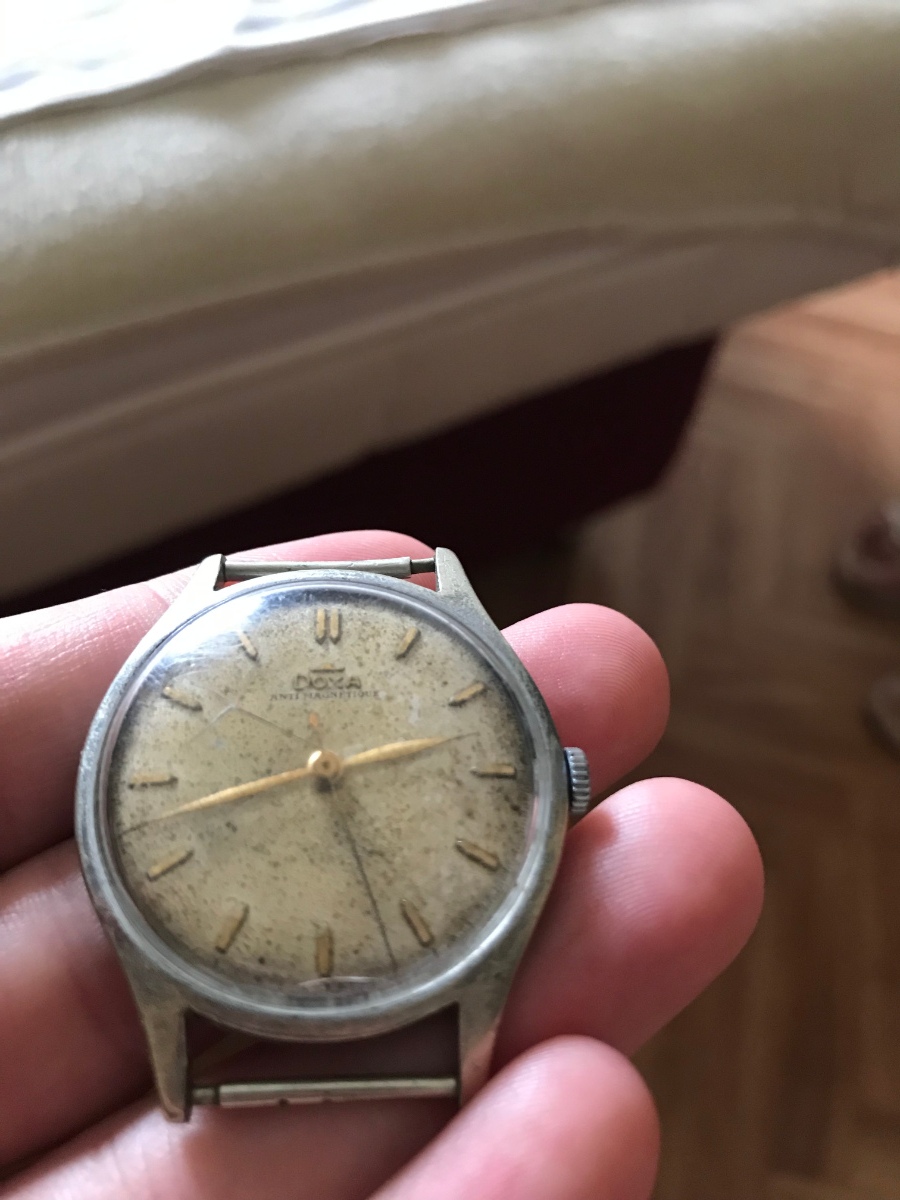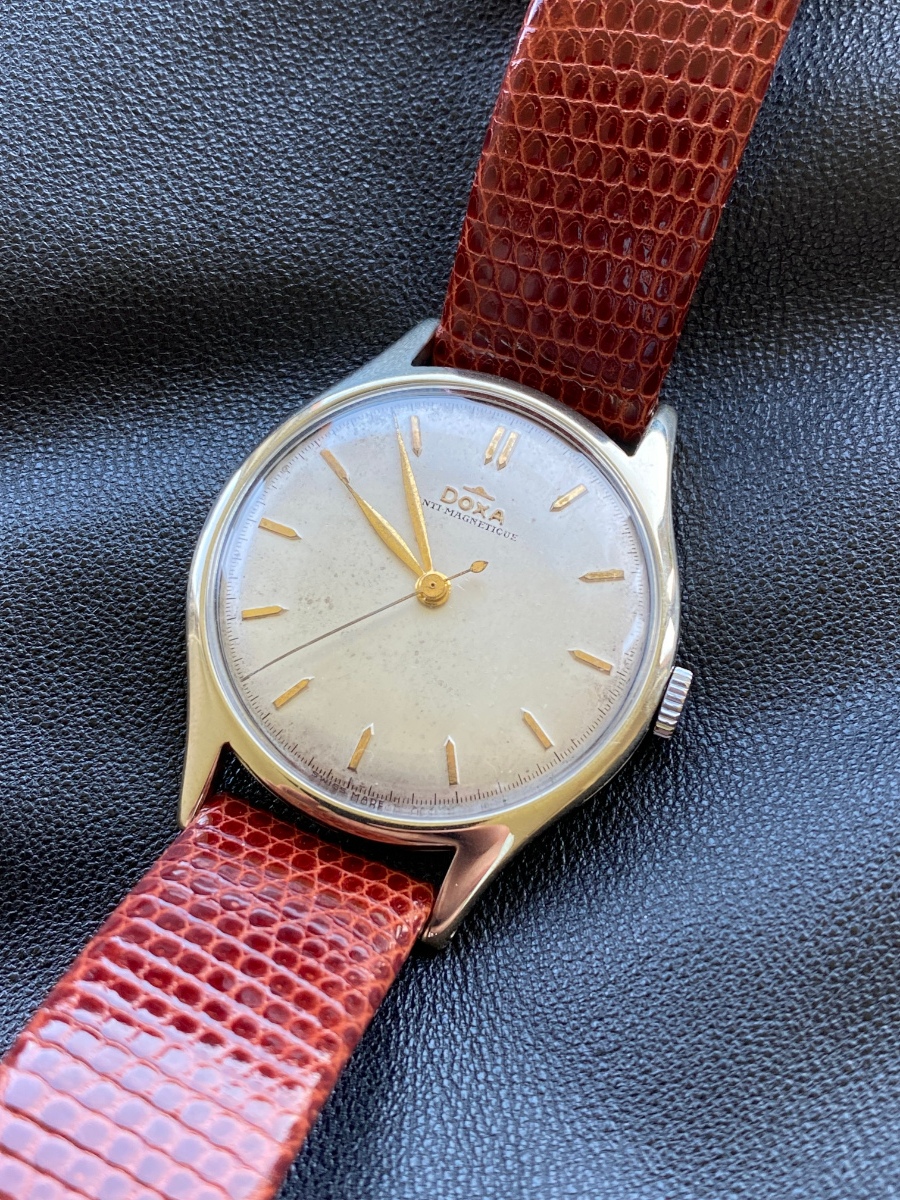 Trochu to tady oživím - hodinky Doxa Antimagnetique, které v 50. letech dostal jako dárek můj děda. O vyleštění pouzdra se skvěle postaral místní člen vojtamalenak. Cifr jsem vyčistil metodou ultra soft kartáček a tekuté mýdlo, za konzultaci děkuji Delawer-ovi. A můj místní hodinář provedl servis strojku a výměnu prasklého sklíčka. Nakonec jsem je dal na hnědo-zlatou ještěrku od Di-Modell - jedna z mála značek, která ji má v šířce 17 mm.