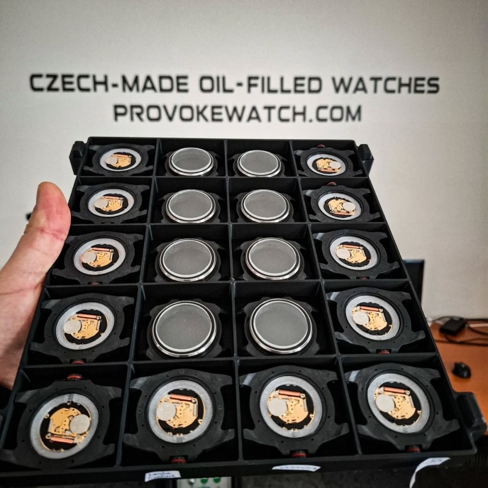Krátké shrnutí, jak pokračujeme. Je to masakr. Do oleje máme ready dvacet kusů. Byl to samozřejmě boj Ben se s tím hezky popral, ale na mě vyskočil celkem zásadní problém, a to je lepení kompenzátoru do dýnka. Když jsem lepil jeden, nebyl to problém, ale u více kusů se to pokazilo. Lepidlo je dvousložka a dost speciální kvůli druhům materiálu a odolnosti kvůli oleji. U nás se ani nedá koupit. Protože máme malou spotřebu, nestihneme spotřebovat to, co je v mísicí špičce, a tam to ztuhne. Takže jsem musel nakreslit vlastní mísicí špičku (našel jsem to, co potřebujeme, na netu, ale dodání za měsíc, proto vlastní řešení) a k tomu rovnou celý dávkovač. A protože jsem zjistil, že je lepší mít volné obě ruce, tak rovnou řešení, kdy dávkování lepidla řeším pedálem na zemi. To vše je z 3D tiskárny a pak několik dalších komponent. Bez tisku si tenhle projekt nedovedu představit — to by byl o rok později a o milion dražší. Když shrnu lepení, to, co mělo být na max hodinu, nakonec bylo na skoro tři dny a ještě dvakrát večer práce z domu. Takže luneta opět odsunutá o týden. A teď info k barevným variantám ručiček. Všude, kde je jiná barva ručiček než bílá a černá, uděláme bílou vteřinovou ručičku. Ta oranžová je tam hnusná, jinak se to říct nedá. Dnes nalakujeme vteřinovky a pak sem přidám foto. Tenhle rok už jedu z posledních sil, posledních osm měsíců je jeden velký masakr. Světlo na konci tunelu se ale dost blíží, takže do toho šlapeme, co se dá. Nejhorší na tom je, že se nedá pořádně nic časově naplánovat. Vždy do toho skočí něco, jako třeba teď lepení. Na tomhle projektu je krásně vidět, jaký je rozdíl udělat jeden zkušební kus a pak rozjet sérii. Ten jeden kus vždy nějak člověk „slepí“. U série už to tak prostě nejde. A tohle je i důvod, proč jsem ukončil předčasně kampaň. Už teď je to pro nás spíš za hranou a nedovedu si představit, co by to obnášelo, kdyby kampaň běžela 45 dní. Je to pro nás jako zátěžový test v Ano, šéfe — jenže my ještě ani nemáme tu hospodu To je v krátkosti vše, co jsem měl na srdci. Jako vždy si nestěžuji, jsou to fakta: jak pokračujeme, co nás trápí a co se povedlo. Přeji všem členům klidný pracovní týden.
