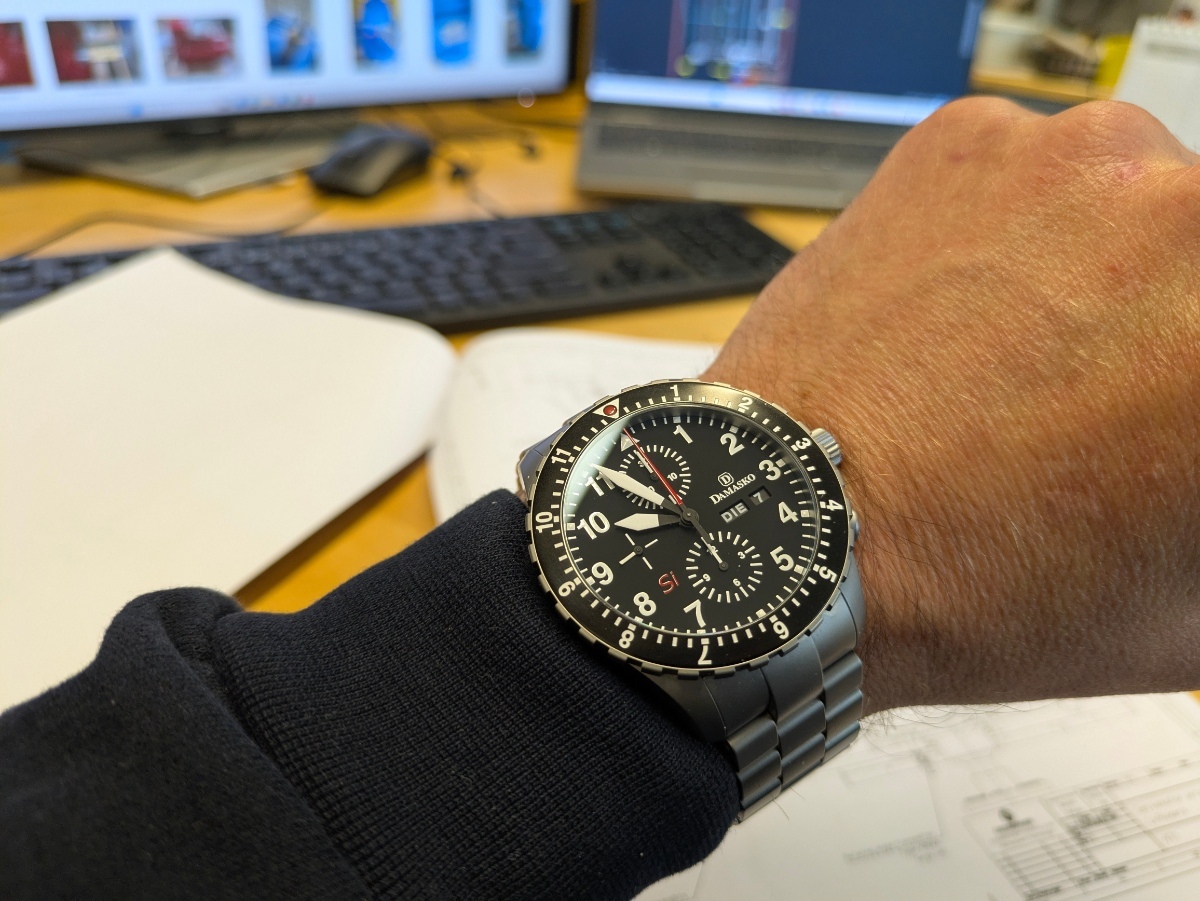 Tak po 10 měsících jsem konečně dostal zprávu, že hodinky jsou připraveny k vyzvednutí. Samozřejmě, že jsem je chtěl vyzvednout osobně a přitom se vetřít do výroby a nechat si to tam vše ukázat - což se povedlo. Člověk vidí na všechny výrobní kroky, vše si může ošahat, podívat se zblízka. Hlavní hodinář na chronografy (mimochodem taky Vladimír) mi pak na mikroskopu ukázal rozdíl mezi standardním krokem a Damaska Si upgradem. Je to vyrobené jako jeden kontejner, kterým se nahradí ten z Ety. Nevýhodu jsem měl, protože mám ještě jeden ze starších modelů, že bylo potřeba nové pouzdro aby šel nasadit tah. Nové pouzdro už nemá vrtané nožičky. Vyměnili mi cifernik, ručku stopek, lumi-bod v lunetě, komplet těsnění, datum a den v týdnu za německý. Všechny díly jsem dostal zpět (i staré pouzdro se sklem). Co se týče té spony tak působí trochu jako plachta, tím, že se tah nezúžuje. Ale nikterak mě to neobtěžuje. Otevření spony se dělá trochu nezvykle zatáhnutím za ty delší tlačítka, ne zmáčknutím jak je na 99,9% hodinek zvykem. Posun jde dělat úplně jednoduše - nemusí se sundávat z ruky. Pouze se zmáčknou malá kulatá tlačítka, čímž se uvolní aretace a jde posunovat. V rozmezí 2 cm. Po cca. 2,5 mm krocích. Zpracování je klasický hodně technický styl - třeba to, že každý šroubek je dělaný na hvězdičku, i ty menší i ty větší - stejně jako na tahu. Líbí se mi to. Řve to do světa (ostatně jako celé hodinky): "ICH WAR IN DEUTSCHLAND HERGESTELLT!" Je dobré že nikde nejsou žádné ostré hrany, ani chlupotržné škvíry. Takže pohodlí je v pohodě.